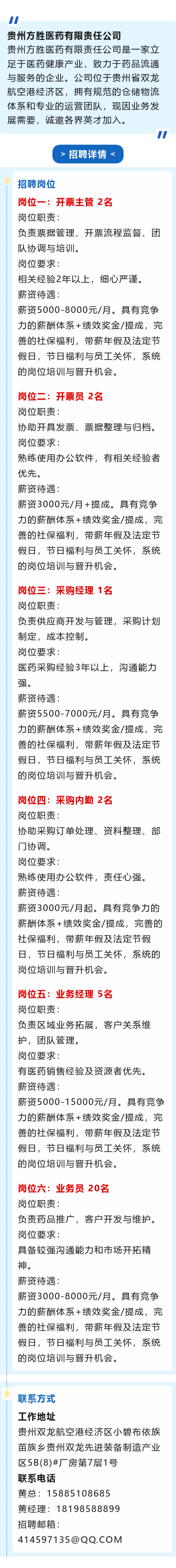 【贵州双龙航空港经济区】贵州方胜医药有限责任公司6岗招聘!月薪可达15000元!