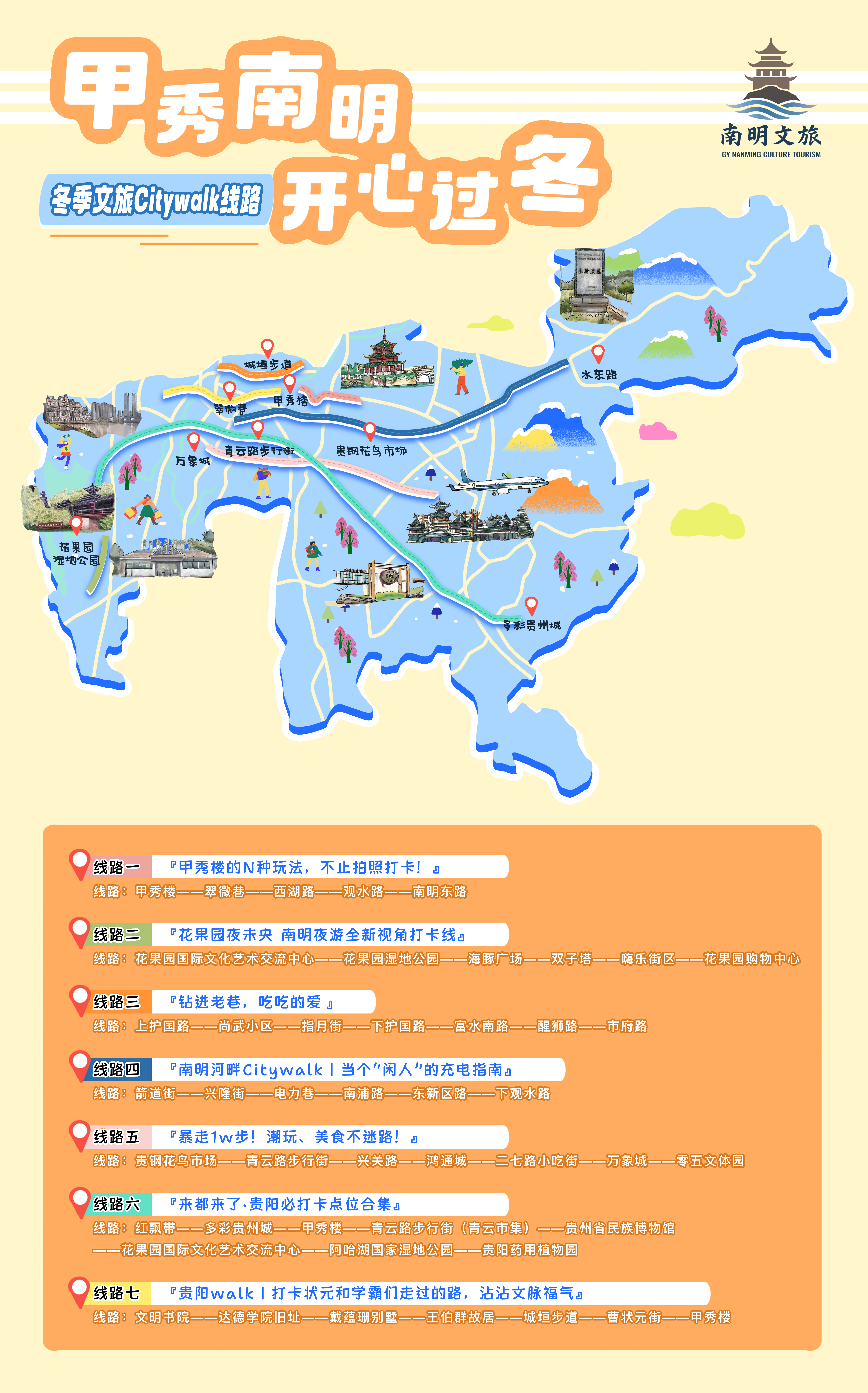 七条线路由五条主题线路和两条风景人文线路组成,各具特色、亮点纷呈。其中,五条主题线路精准聚焦不同兴趣主题,满足游客的个性化需求。“甲秀楼的N种玩法,不止拍照打卡!”线路延伸景区玩法,引领游客从贵阳地标甲秀楼出发,漫步翠微巷、西湖路、观水路、南明东路,深入探寻甲秀楼周边深厚的历史文化肌理与静谧的街巷风情。“花果园夜未央,南明夜游全新视角打卡线”聚焦璀璨夜景,从花果园国际文化艺术交流中心、双子塔等地标到海豚广场、嗨乐街区等商业综合体,展现南明区活力四射的夜间经济魅力。“钻进老巷,吃吃的爱”打造寻味之旅,串联上护国路、下护国路、醒狮路等众多地道美食老店与小馆聚集的街巷,为游客提供一场贯穿舌尖与记忆的美食探索。“南明河畔Citywalk|当个‘闲人’的充电指南”主打松弛闲适,游客可穿过箭道街、兴隆街、电力巷等街巷,在咖啡馆、精酿酒馆和特色餐厅中,享受一段“充电”时光。“暴走 1w步!潮玩、美食不迷路!”突出潮玩美食,游客可从贵钢花鸟市场的烟火气,逛到青云路步行街的潮流范,再探访万象城的时尚与零五文体园的活力。
