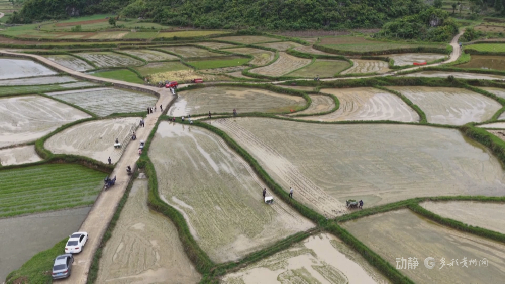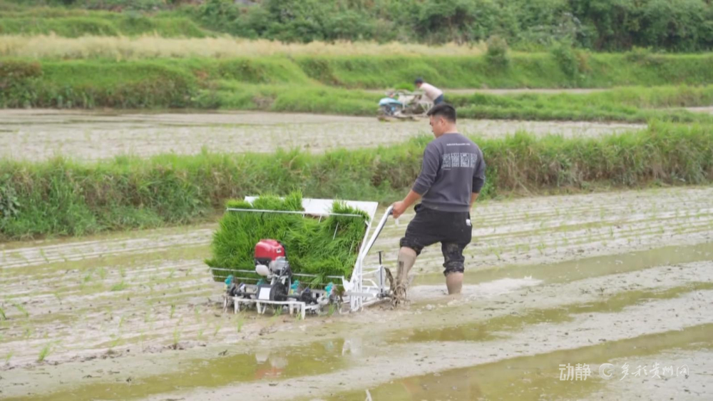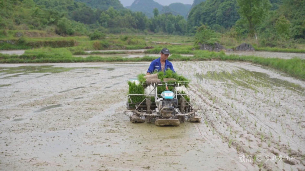 在黔南州平塘县者密镇和平村,水稻秧苗“坐”上了插秧机,整整齐齐在水田里安了“家”。和平村党支部书记、村主任罗廷波高兴地说:“机耕道通了之后,一天一台插秧机可以插10到15亩,要顶15个劳动力。”