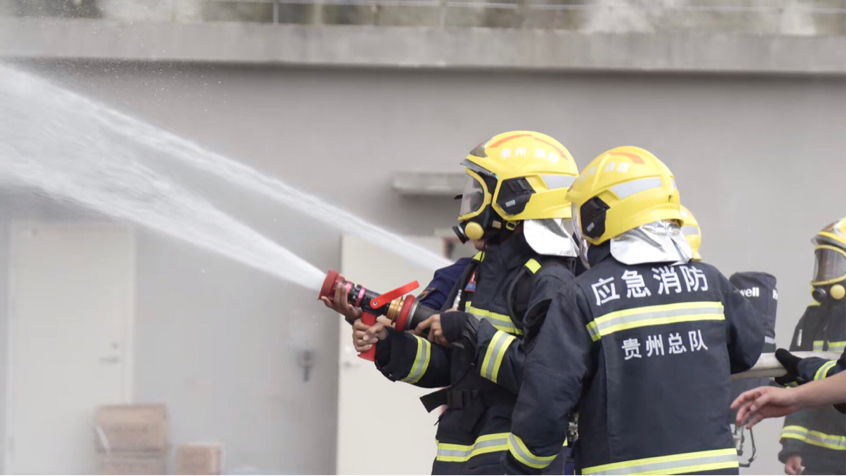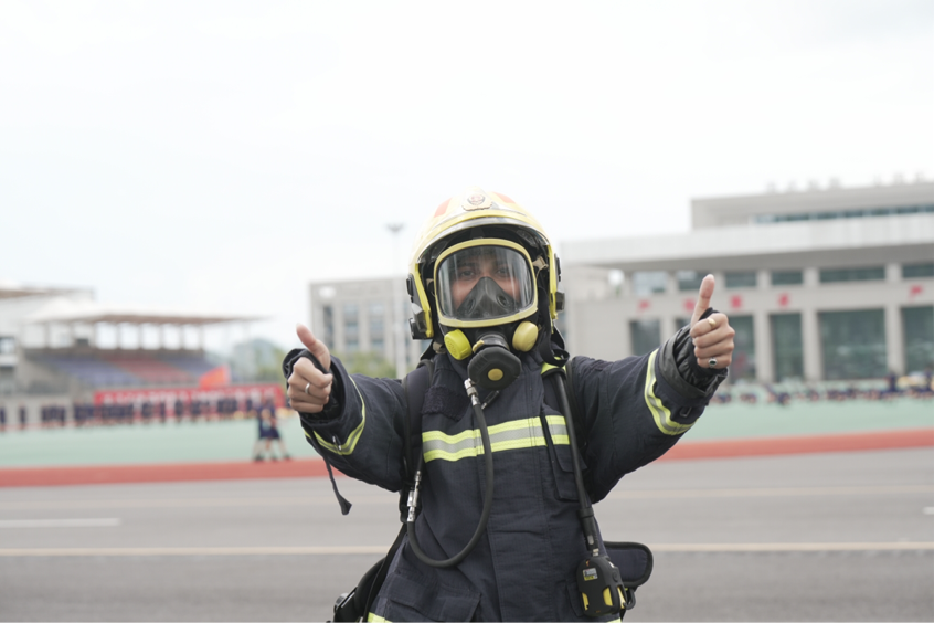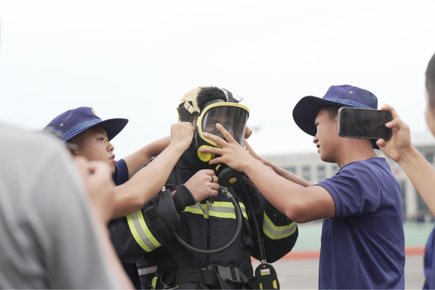 过程中,一行人来到训练场地亲身体验消防员日常穿着的灭火防护服和空气呼吸器,切身体验消防员工作装备。重达30多公斤的防护装备让青年们感受到消防员在高温环境下负重作业的辛苦,他们在拍照时不禁竖起大拇指,这不仅是对贵州消防指战员的致敬,更是对中国消防安全力量的致敬!