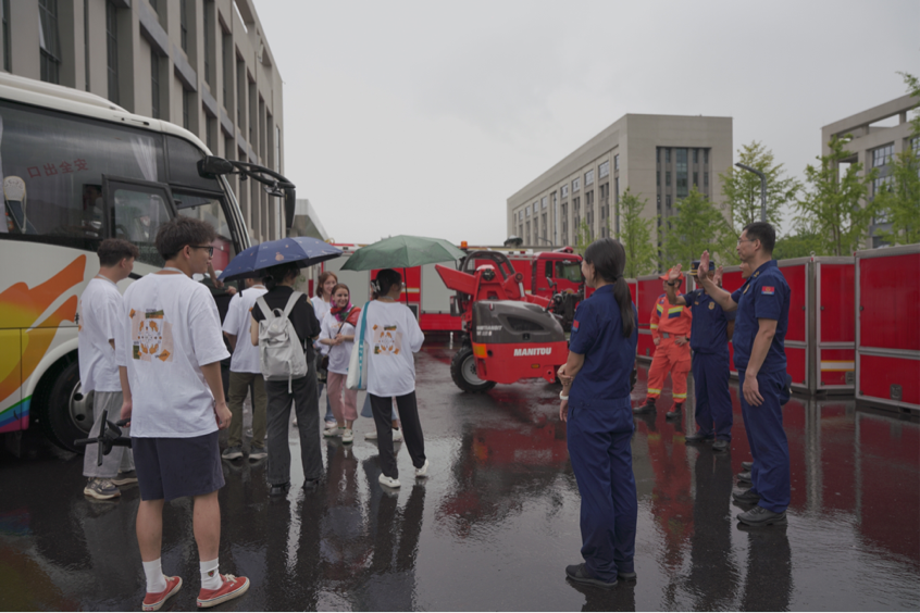 而后,一行人沉浸式参观了贵州省消防救援训练与教育基地的营区布局、训练环境,了解了消防员训练、生活制度,对消防的理解由知之甚少变为有所深入了解。消防员严格有素的训练让留学生青年不禁对其肃然起敬,时间管理、军事化训练等则更是让留学生青年对消防员致以诚挚的敬意和钦佩之情。