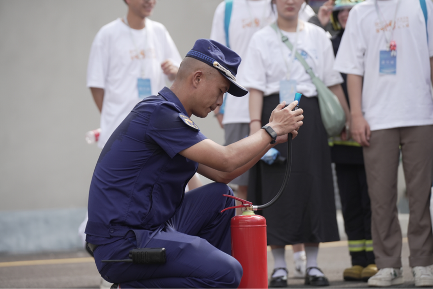 脱下消防防护装备,一行人在消防员的带领下学习了干粉灭火器的使用,让大家不仅学会使用方法,更将理论与实践结合使青年们亲身体验灭火器扑灭油池火灾,彻底掌握干粉灭火器的正确使用方式和初起火灾的扑救方法。
