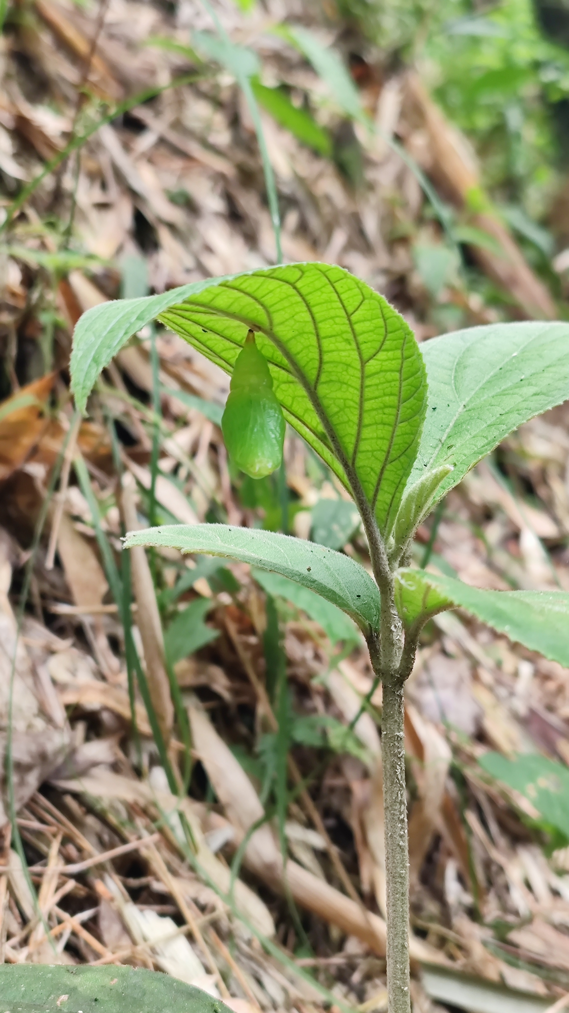 树叶下的蝶蛹。2022年5月,摄于红河州金平县。 李艾蓉 摄