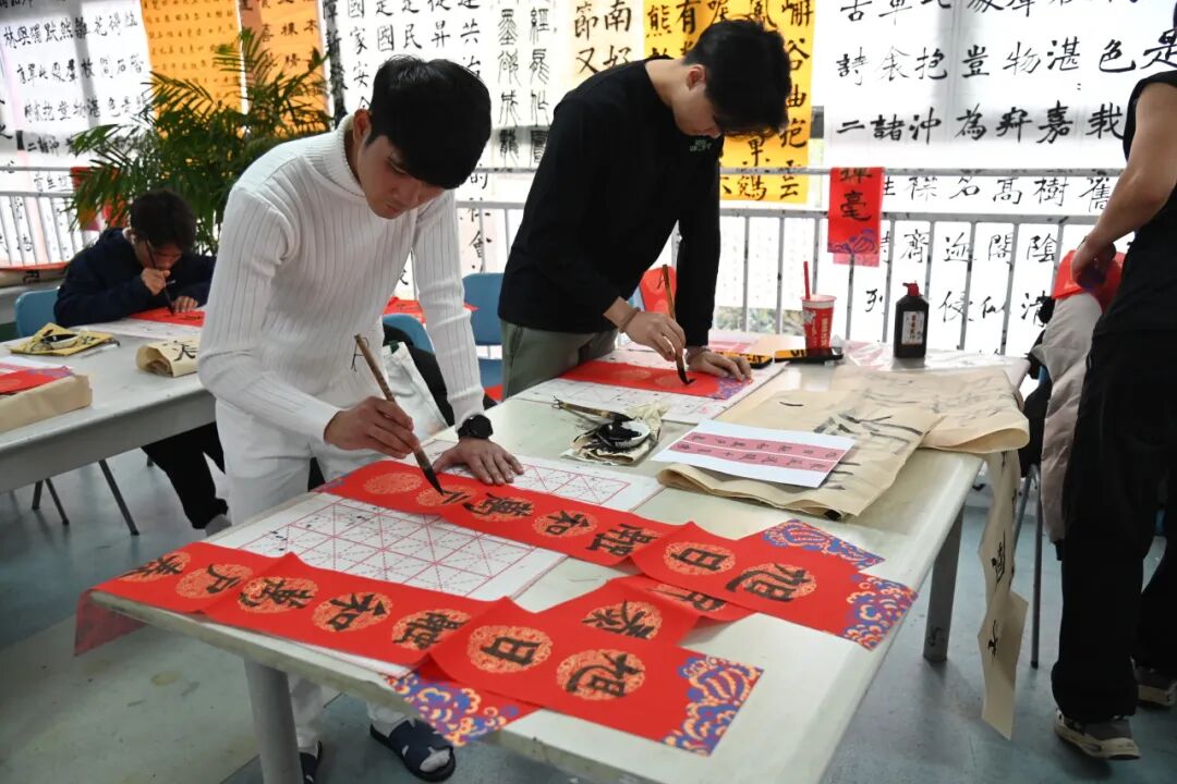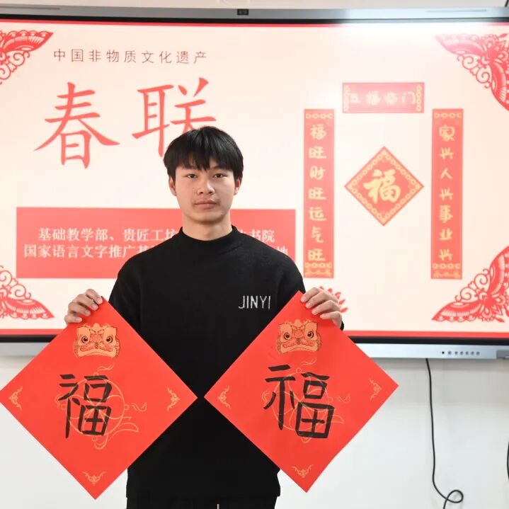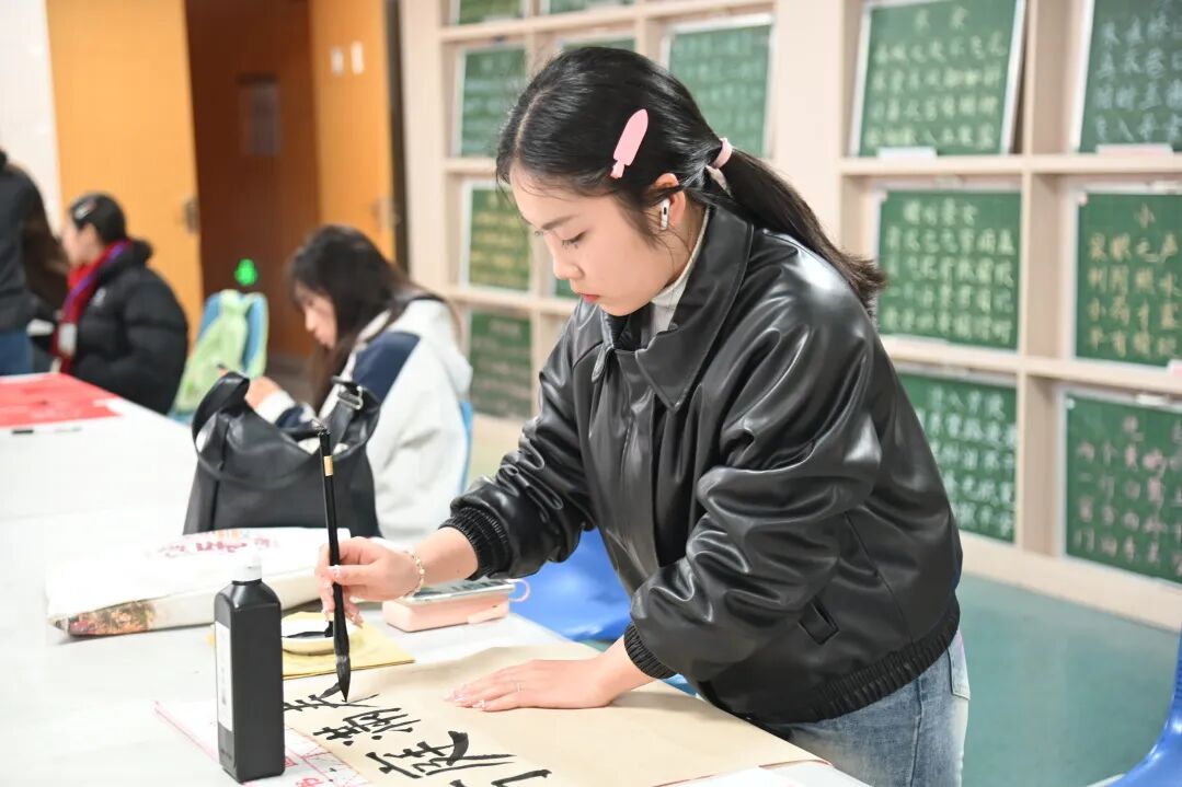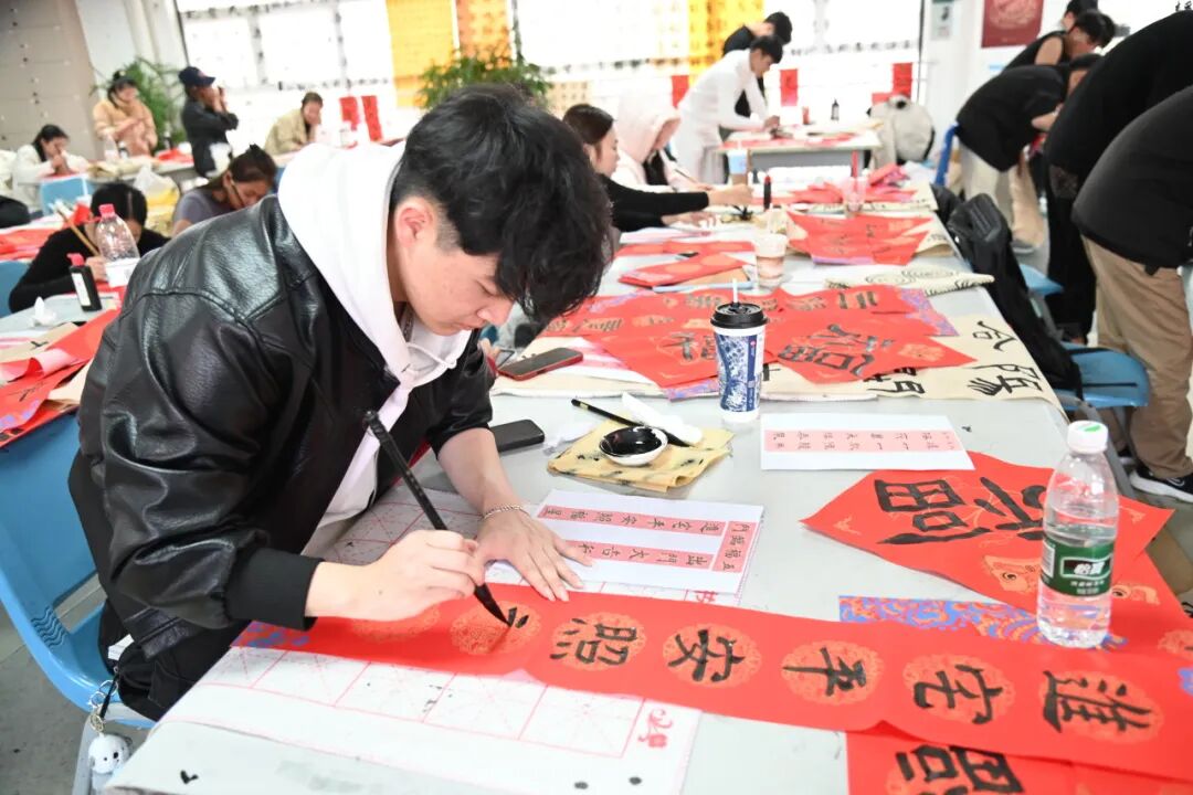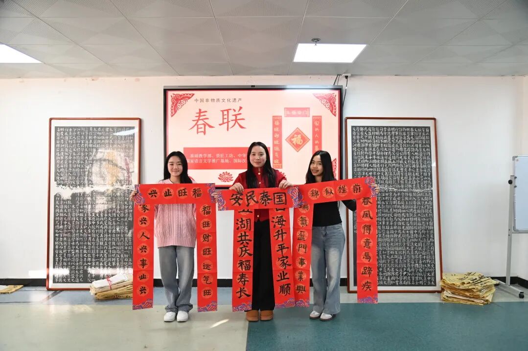 活动现场,一幅幅红彤彤的春联挂满了展厅,墨香四溢,年味十足。同学们手持自己的作品合影留念,脸上洋溢着满满的成就感。