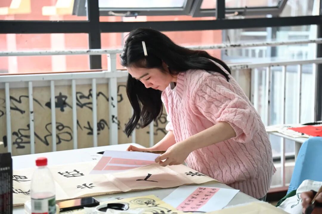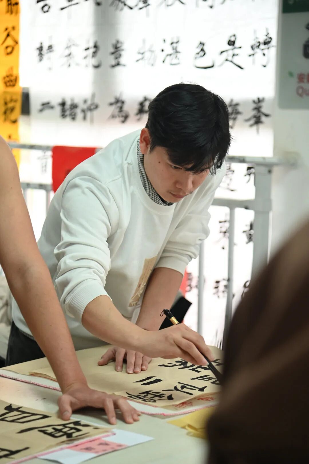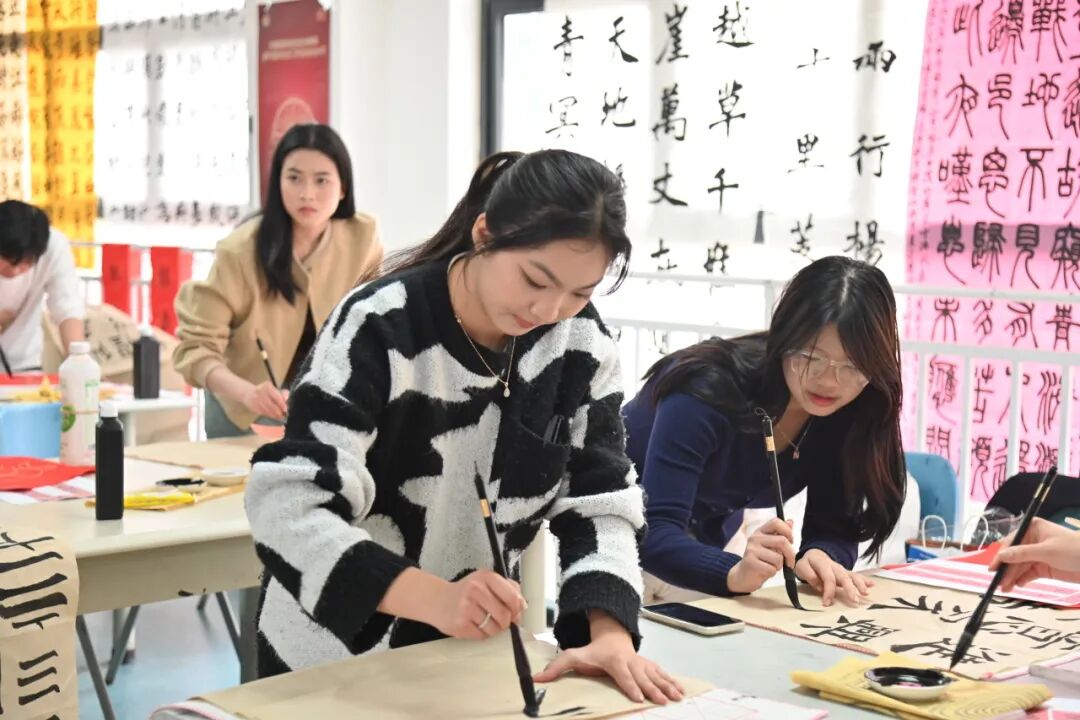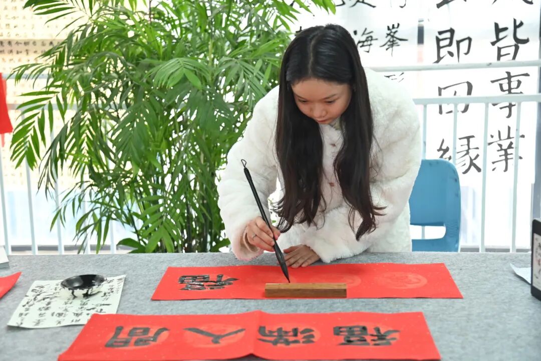 活动现场,一幅幅红彤彤的春联挂满了展厅,墨香四溢,年味十足。同学们手持自己的作品合影留念,脸上洋溢着满满的成就感。