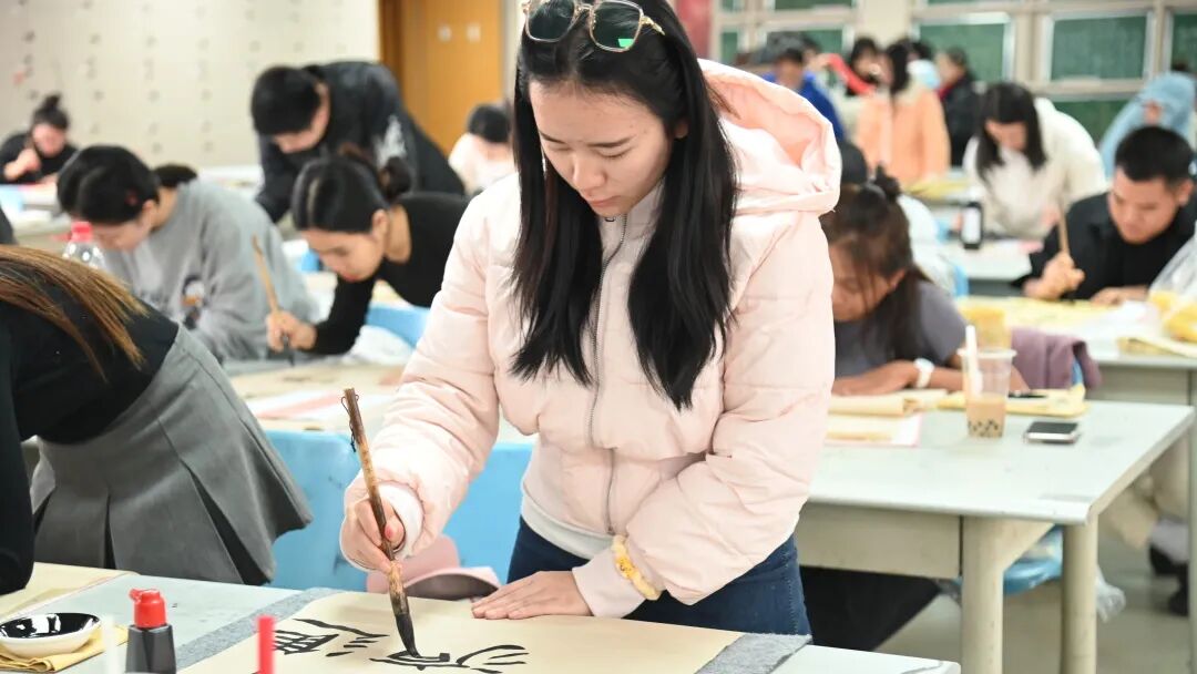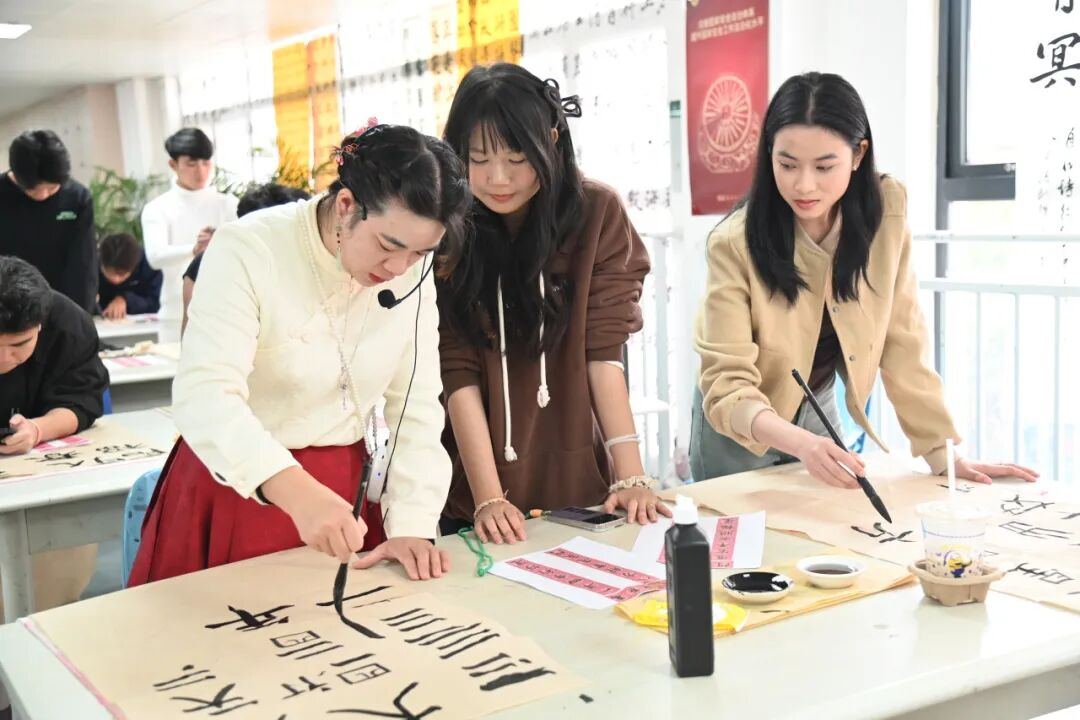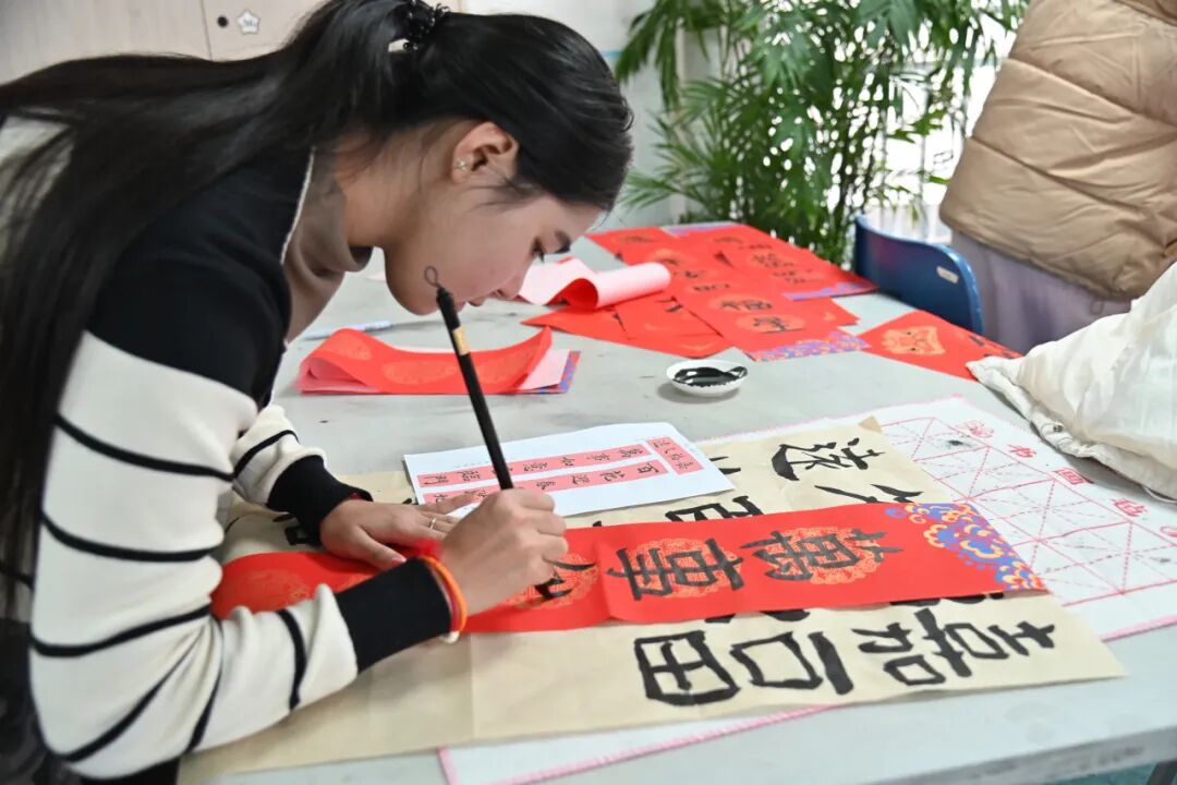 活动伊始,学校书法老师为国际学生讲解了春联的起源、寓意和书写技巧,从汉字的笔画结构,到笔墨的轻重缓急,进行了书写示范。尤其是“福”字的多种写法、春联对仗的讲究,让国际学生产生了浓厚兴趣。大家认真聆听,纷纷举手提问,现场氛围热烈而融洽。