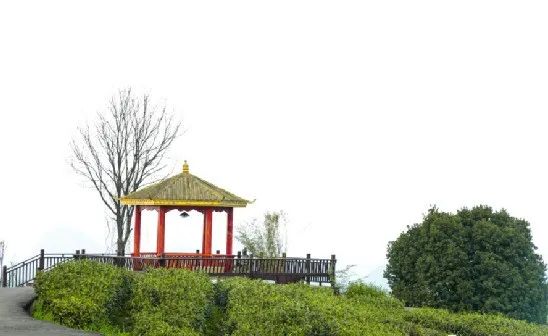 一望无际的茶海上分布着几座形态别致的茶亭,游客可以在茶亭中一边休憩,在满园春色中,来一杯白茶,感受绿意盎然的生命力。