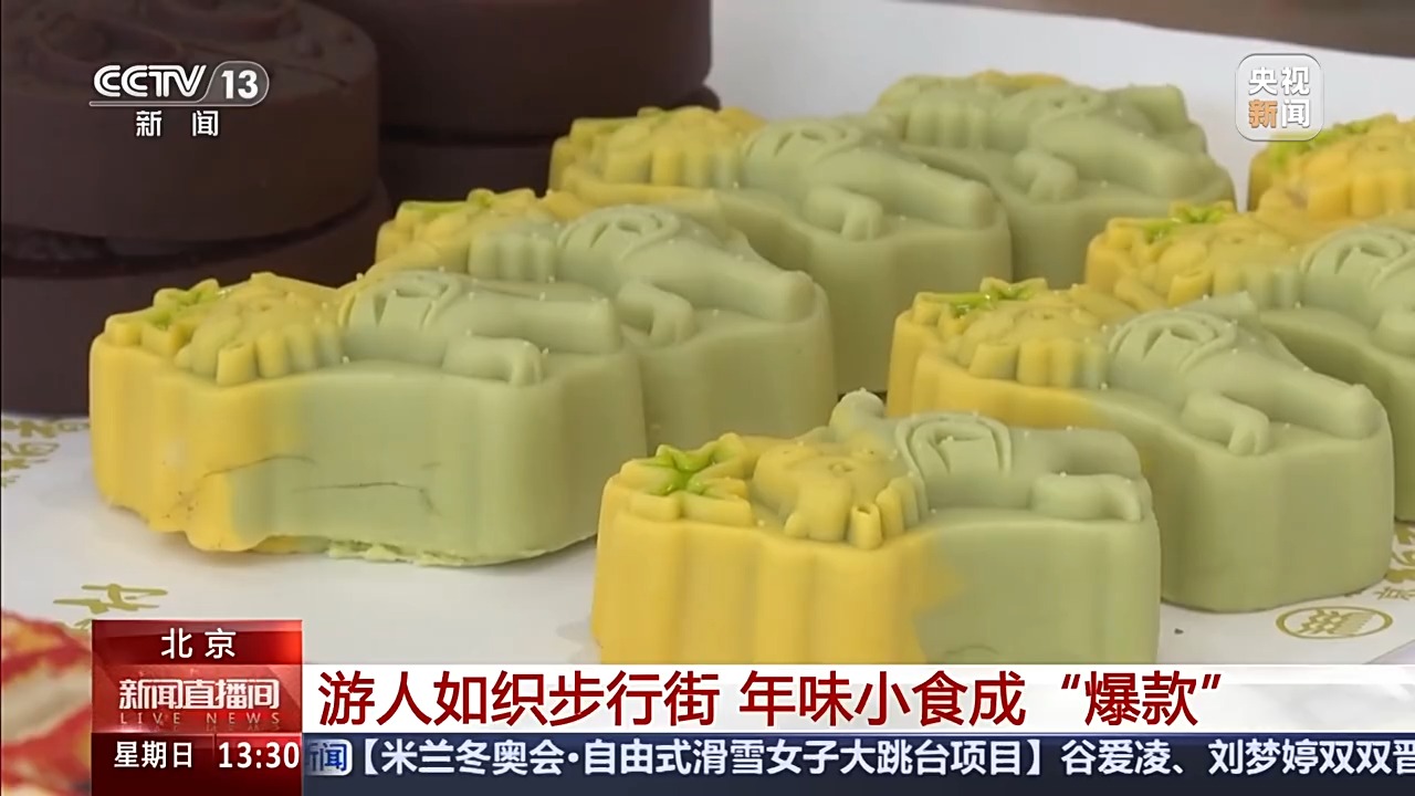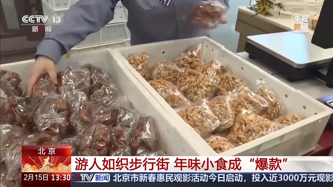 临近春节,北京市东城区的隆福寺街区游人如织,市民游客来到这里买年货、享年味。而在花样繁多的美食中,蜜三刀、奶油麻花和开花枣这三样寓意美好的小点心,更是销售火热。