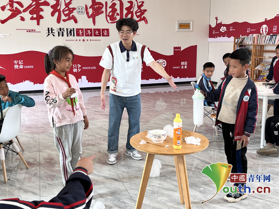 研支团成员指导孩子们做“泡泡龙”小实验。四川师范大学研支团供图