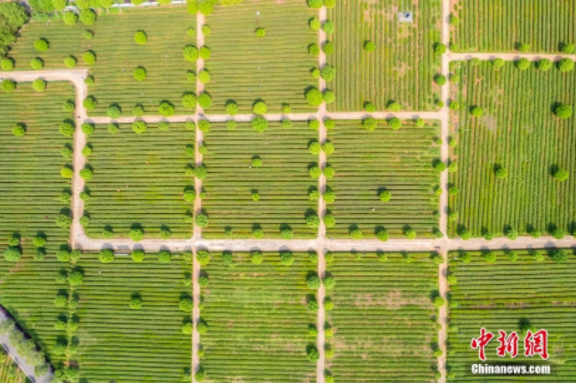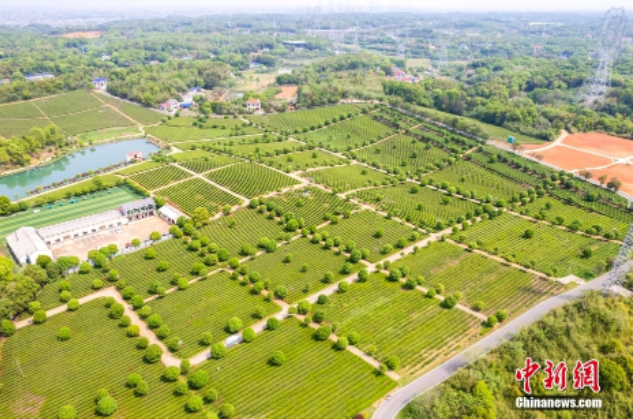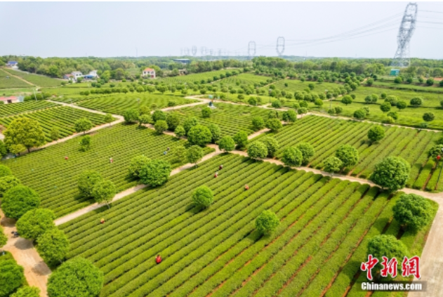 近日,湖南长沙望城乌山贡茶基地茶山如“绿海”。当地的茶树正式进入采摘期,茶农们忙着采摘春茶。(无人机照片)