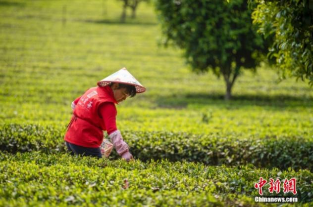 近日,湖南长沙望城乌山贡茶基地茶山如“绿海”美如画。当地的茶树正式进入采摘期,茶农们在山间忙着采摘春茶。