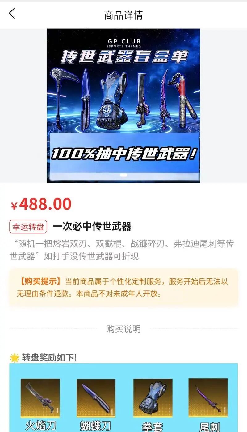 五年级学生小凯在课余闲暇时间喜欢玩和平精英游戏,一心想拥有里面的一款高级装备。前不久,在刷短视频时,小凯偶然看到一个广告,一家俱乐部推出转盘游戏,只要花488元就“必中”这款装备。
