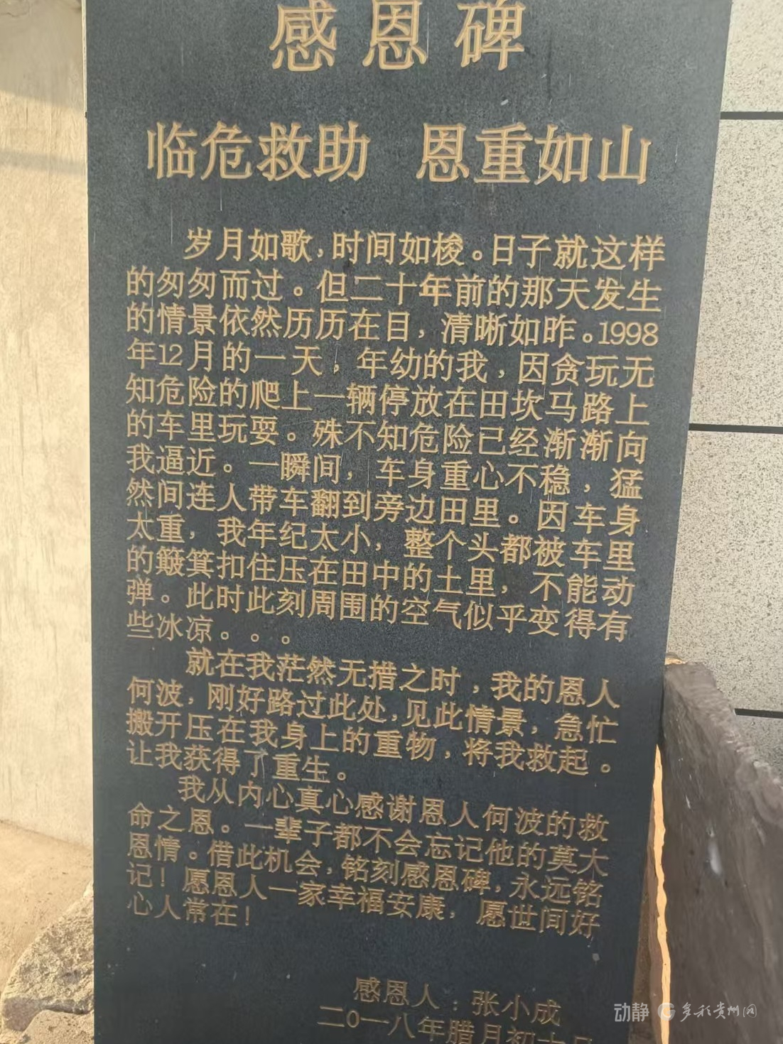 这份刻在骨子里的善良与勇敢,早在1998年就已显现。当年夏天,他在老家的河边游玩时听到呼救声,循声望去,一名男孩正在水中挣扎。他毫不犹豫跳入水中,将人救上岸。二十多年后,当年被救的男孩多方寻找,为何波在家乡立下一块感恩碑。