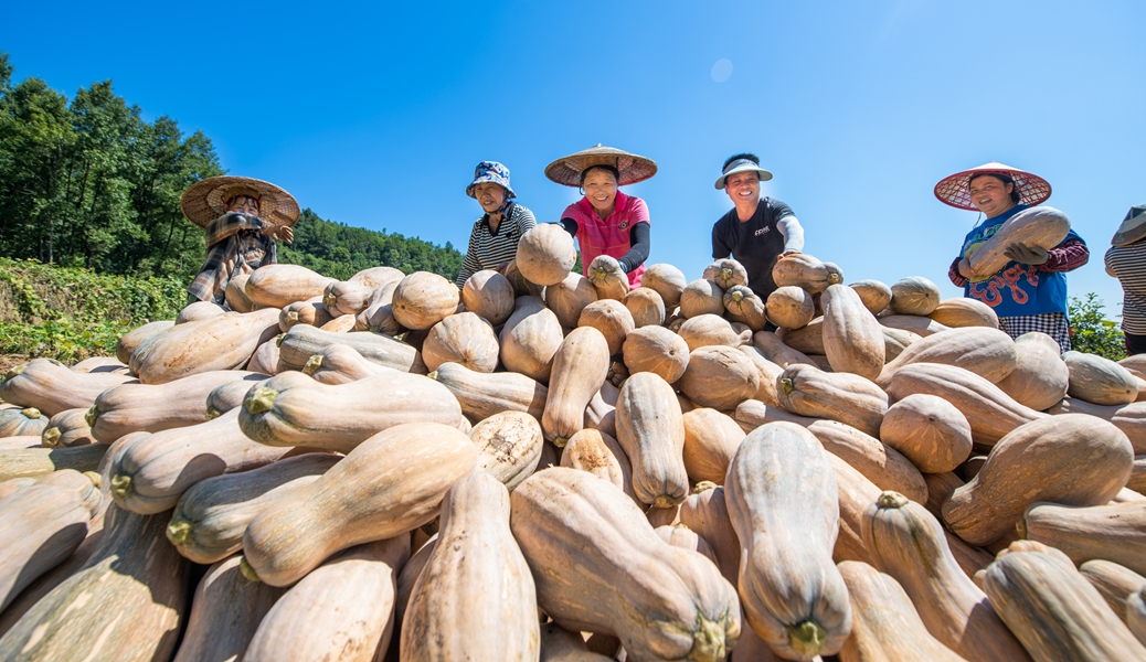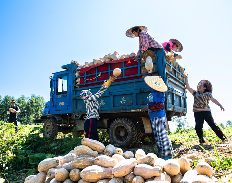 在社学街道红卫村的300余亩南瓜种植基地里,一个个黄澄澄、圆滚滚的南瓜铺满田间,村民们正熟练地采摘、搬运、装车。