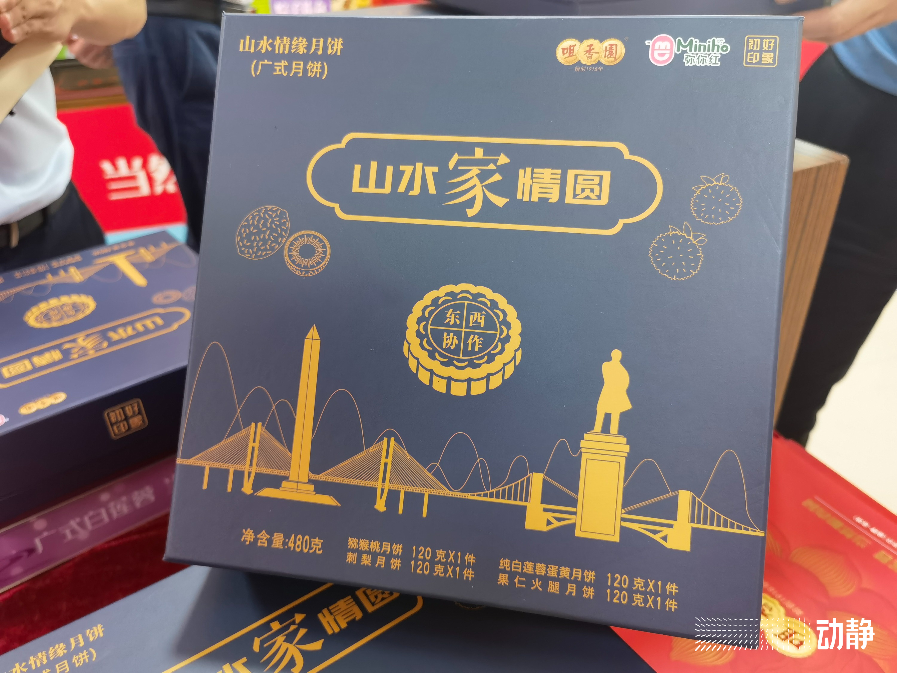 “中山岐江桥和北盘江大桥连在一起,象征着东西协作,也象征着我们中山和六盘水的情谊。” 咀香园食品有限公司董事长梁炳根向记者展示今年中秋新品月饼的礼盒设计时说。