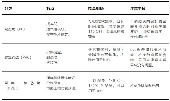 市面上常见的食品级保鲜膜材质主要有聚乙烯(PE)、聚氯乙烯(PVC)、聚偏二氯乙烯(PVDC)和其他生物降解材料。我们总结了材质特点和使用注意事项↓