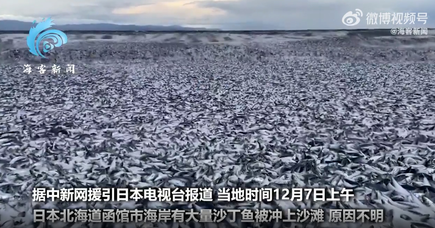 当地时间12月7日上午,日本北海道函馆市海岸有大量沙丁鱼被冲上沙滩,原因不明。当地居民表示,第一次见到这么多沙丁鱼被冲上海岸。