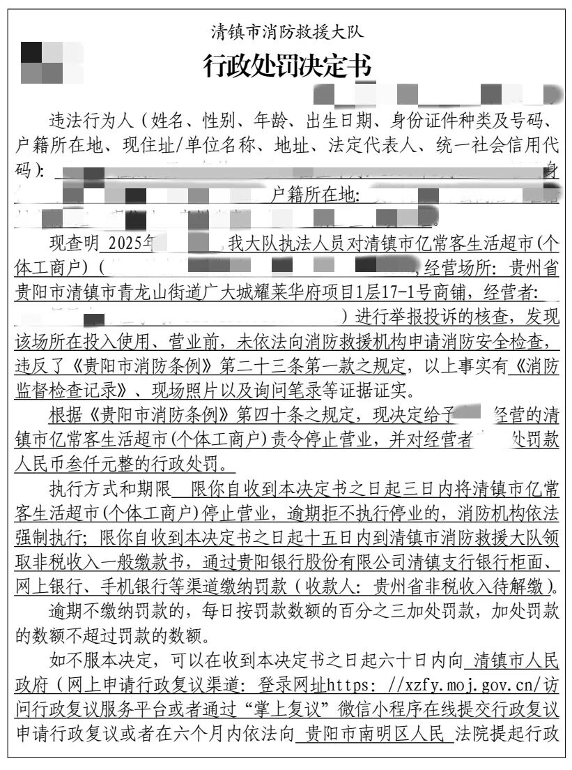 近日,贵阳市清镇消防救援大队执法人员针对投诉举报线索,对清镇市青龙山街道广大城耀莱华府1层17-1号的清镇市亿常客生活超市开展核查。检查发现,该超市在投入使用、营业前,未依法向消防救援机构申请消防安全检查,违反《贵阳市消防条例》第二十三条第一款规定。依据《贵阳市消防条例》第四十条规定,消防部门决定责令该超市停止营业,并对经营者李某处以人民币叁仟元罚款。