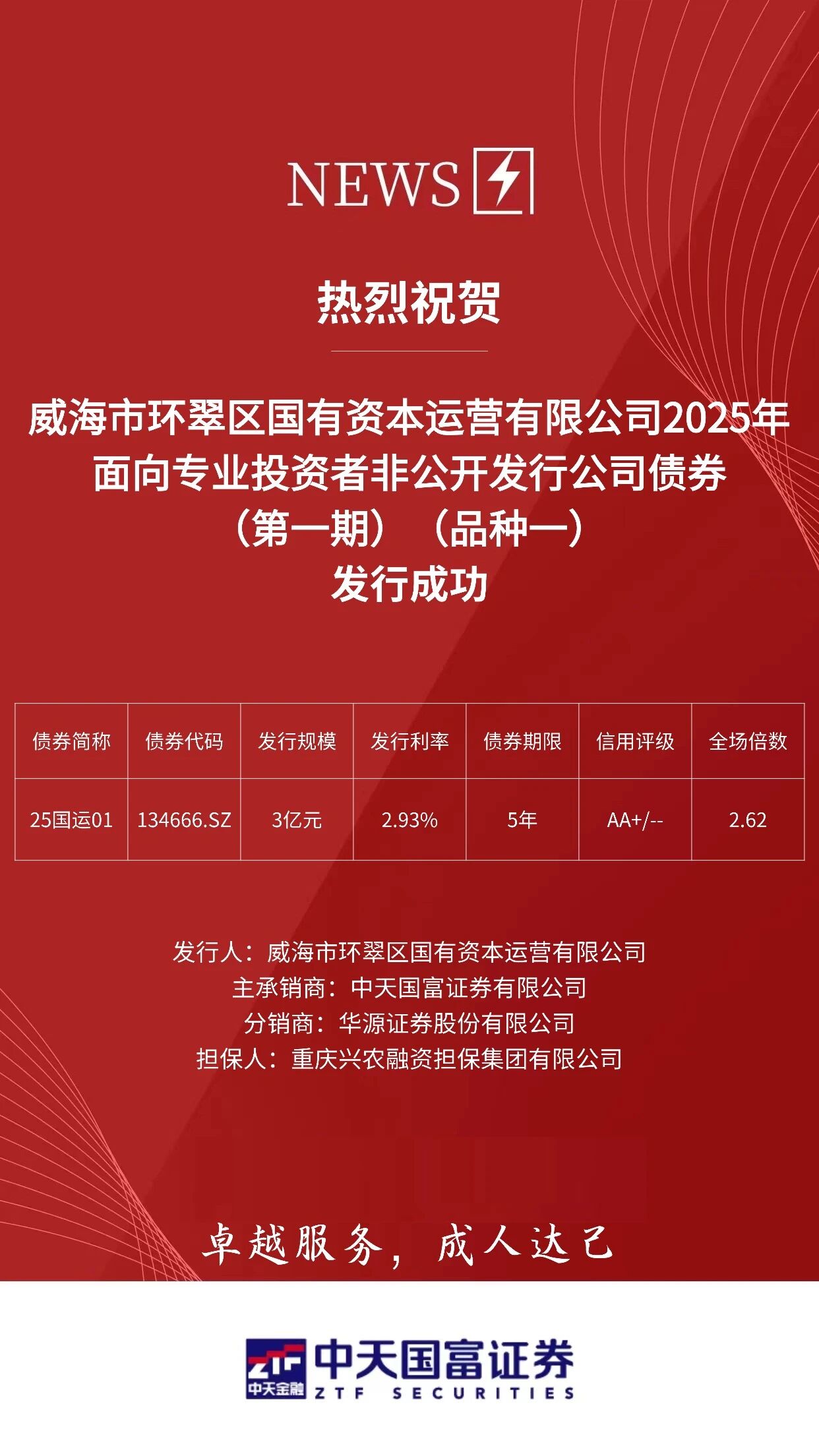 2025年11月24日,中天国富证券以主承销商、簿记管理人、债券受托管理人的身份,成功助力威海市环翠区国有资本运营有限公司(以下简称“环翠国运”)2025年面向专业投资者非公开发行公司债券(第一期)(债券简称“25国运01”)的发行工作。本次发行不仅为环翠区产业升级与实体经济发展注入坚实金融动能,更创下“山东省同期同行政级别新增项目中获批时间最短”的行业佳绩,成为区域资本市场服务实体经济的标杆案例。
