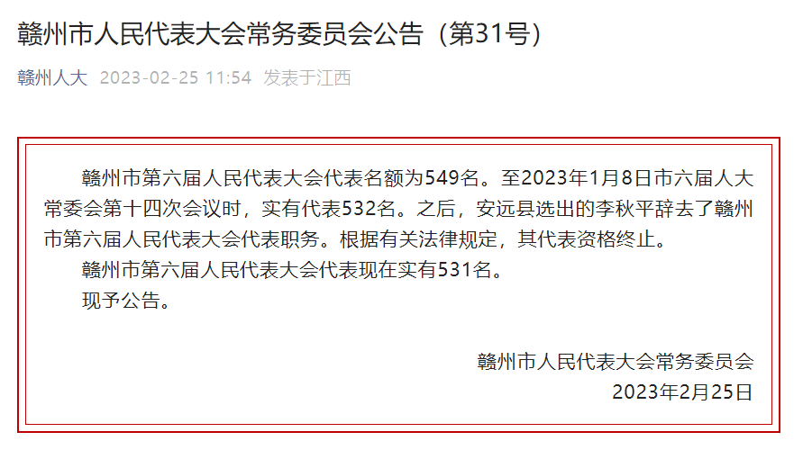 李秋平辞去赣州市人大代表职务 此前因涉嫌猥亵女干部被停职