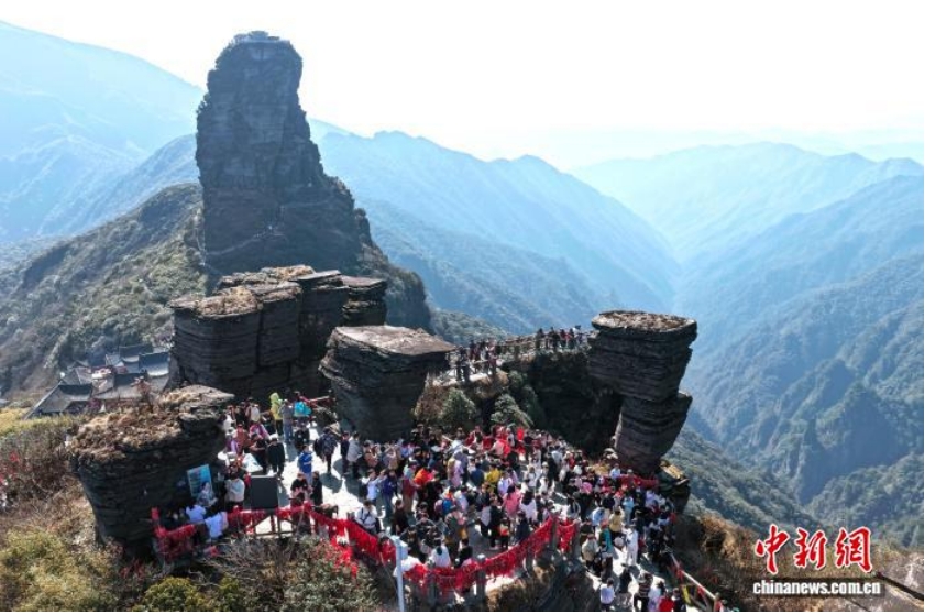 2026年春节假期,位于贵州省铜仁市境内的世界自然遗产地梵净山迎来旅游高峰,全国各地游客齐聚山间,以登高赏景、祈福迎新的方式欢度新春。