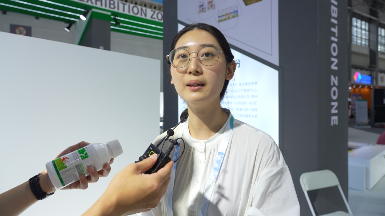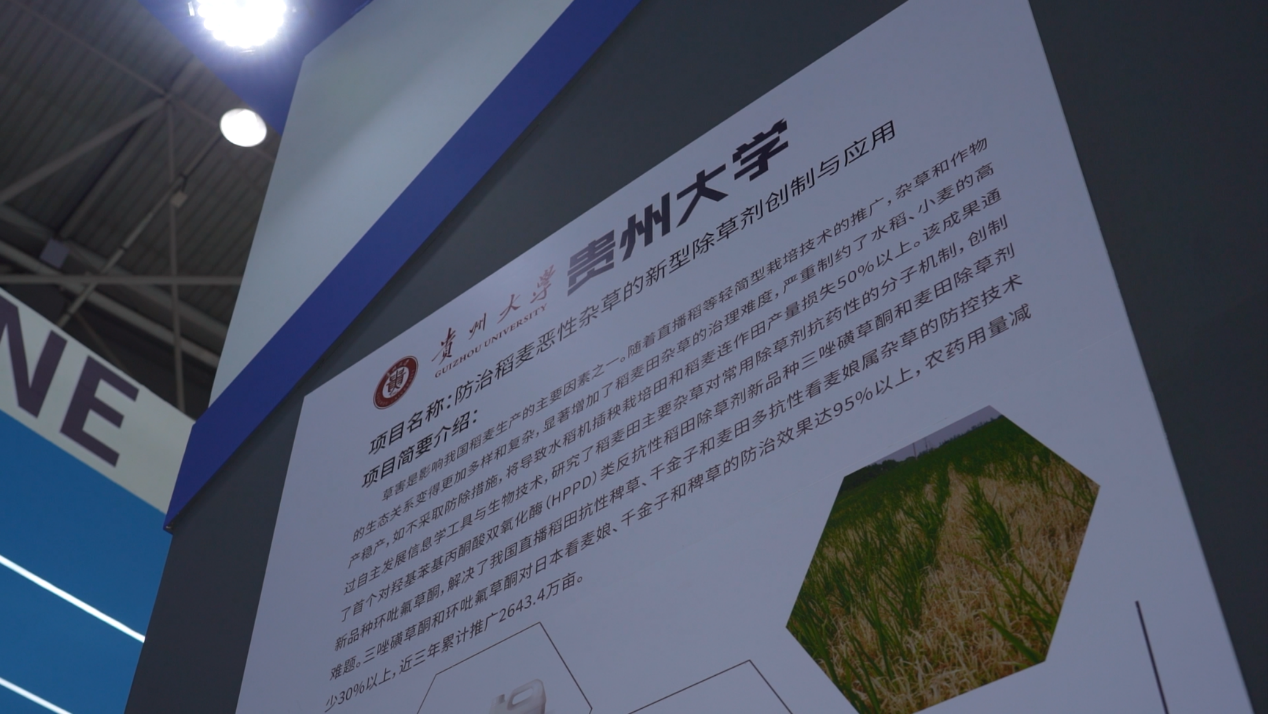 “防治稻麦恶性杂草的新型除草剂创制与应用”是贵州大学自主研发的参展项目,据贵州大学绿色农药研发创制团队陈东雨介绍,这种环保系数极高的“除草剂”已用于贵州茶产业等种植水稻小麦的领域,未来也可用于酿酒用的小麦中。“这是一种绿色农药,我们还做了生物防控,防治恶性杂草可达到95%以上,而农药用量可减少30%”
