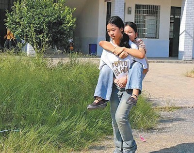 匡语轩背着刘思涵走出教学楼。黄全魁摄