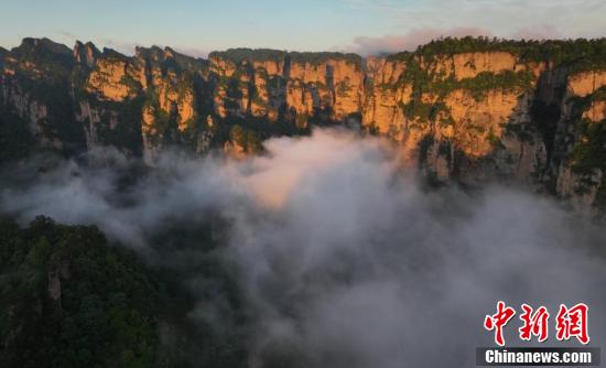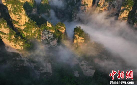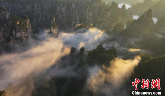 雨过天晴的湖南张家界国家森林公园内,连绵峰林间云卷云舒,如诗如画。阳光穿过云层,洒向山谷,张家界地貌峰林傲然屹立,更为壮观。