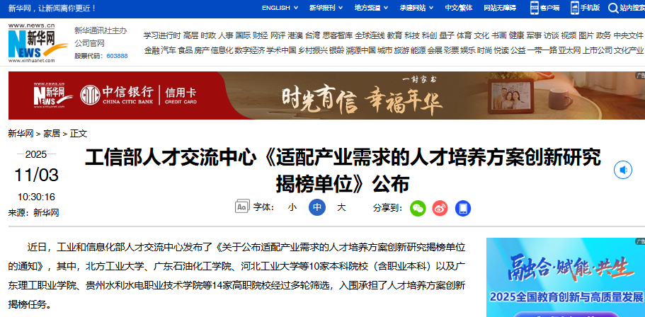 近日,工业和信息化部人才交流中心发布了《关于公布适配产业需求的人才培养方案创新研究揭榜单位的通知》,其中,北方工业大学、广东石油化工学院、河北工业大学等10家本科院校(含职业本科)以及广东理工职业学院、贵州水利水电职业技术学院等14家高职院校经过多轮筛选,入围承担了人才培养方案创新揭榜任务。