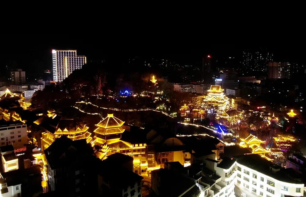山下舞龙舞狮热闹非凡,山上灯展同样璀璨夺目。沿着步行道拾阶而上,18组30余处彩灯将景区装扮得如梦似幻,仿佛置身于童话世界。来自河北的游客王爱国第一次来到兴义,他说:“灯展很漂亮,把景区装点得色彩斑斓。有龙狮表演还有小吃,很热闹。兴义真是个好地方,景色、空气各方面都挺好,明年我们还会来。”