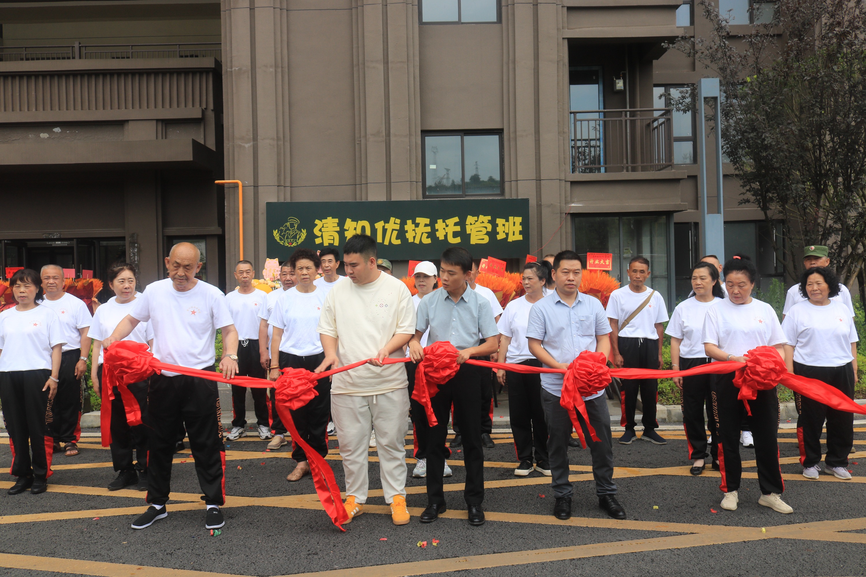 随后,剪彩环节将开业仪式推向高潮。在热烈的掌声中,清知优抚托管班代表人、业委会代表、业主代表和退役军人代表共同为新企业剪彩,象征着清知托管班正式开启新征程。