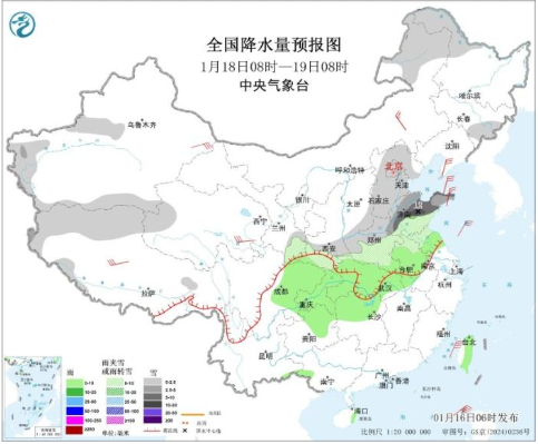 图3 全国降水量预报图(1月18日08时-19日08时)。图片来源:中央气象台网站