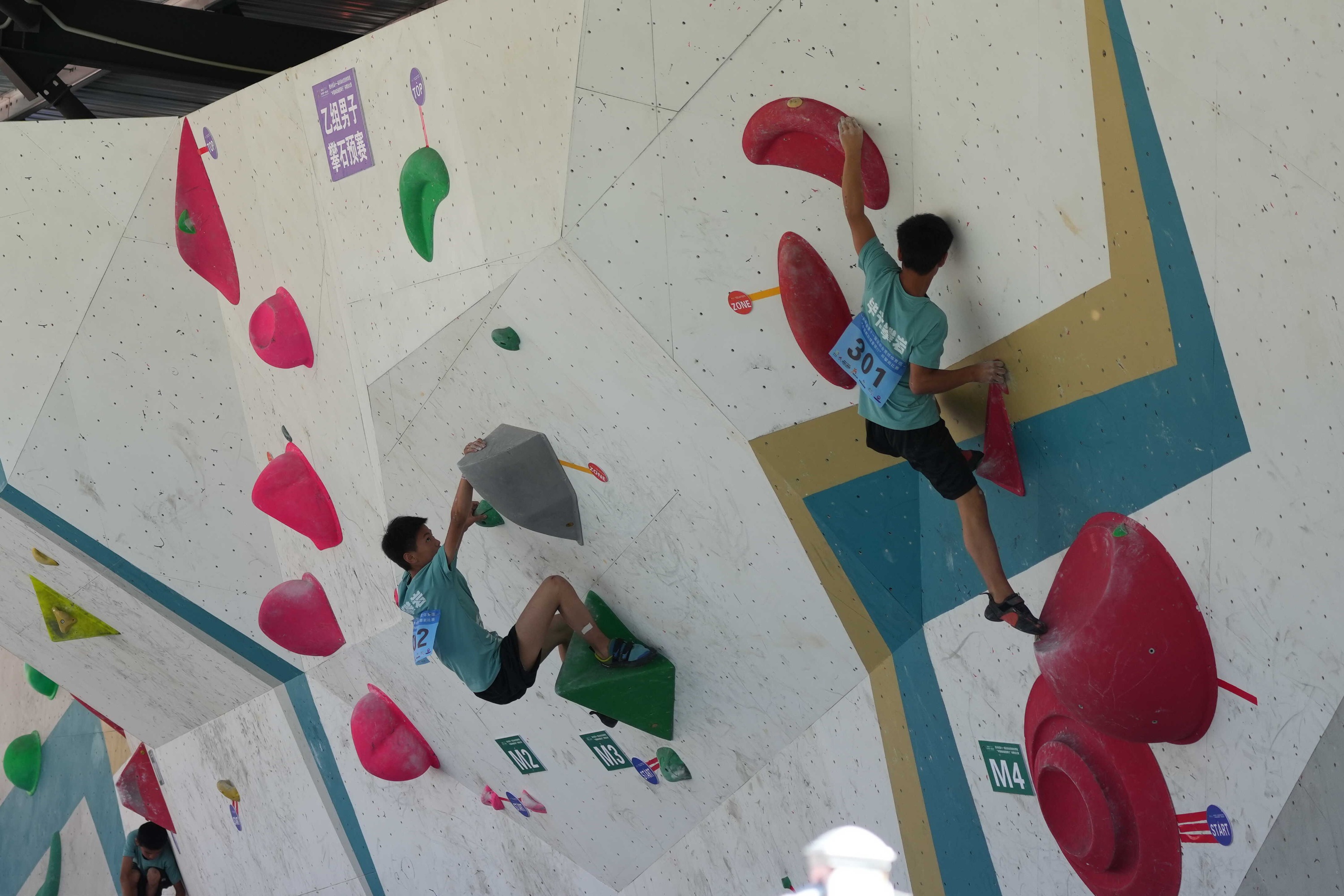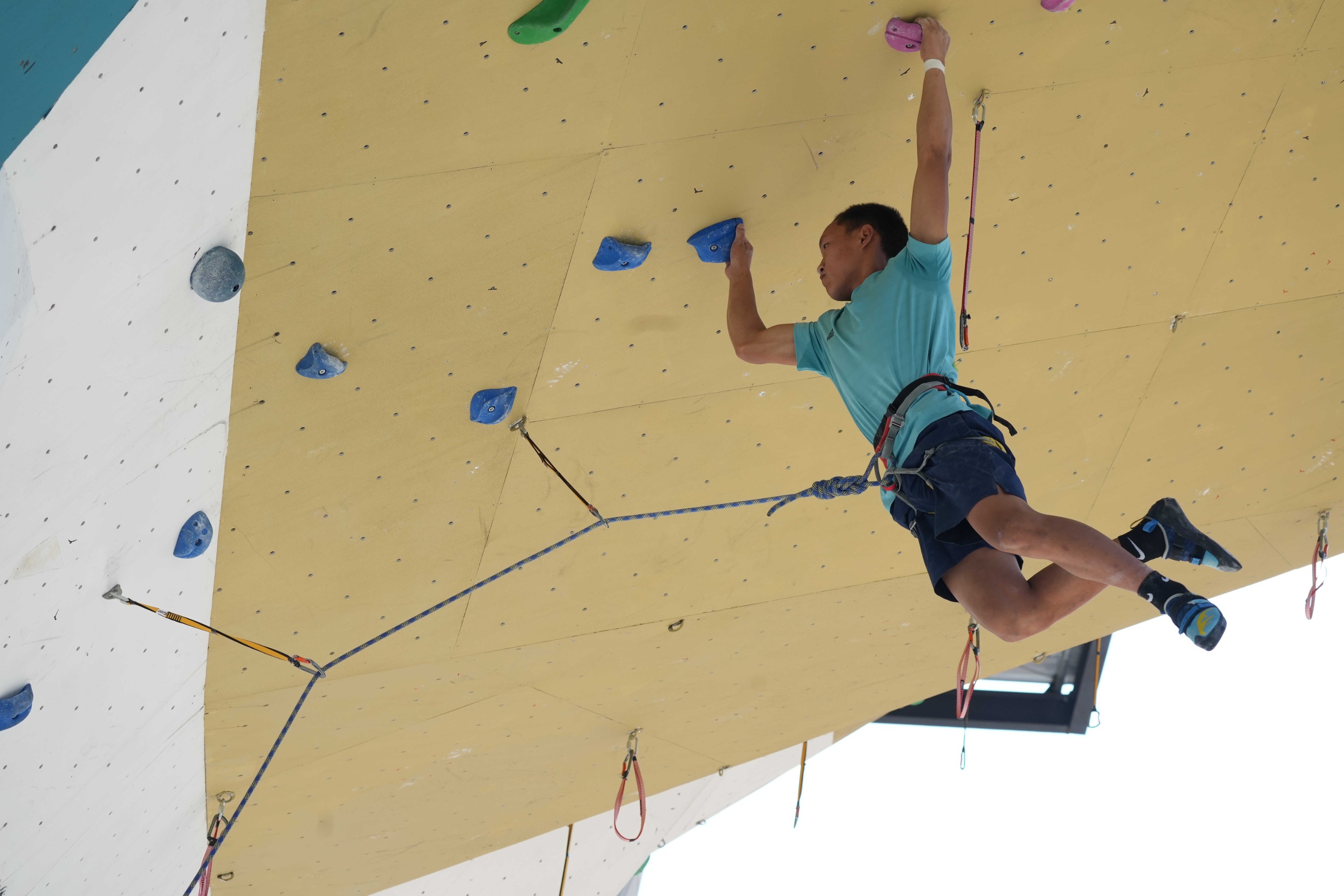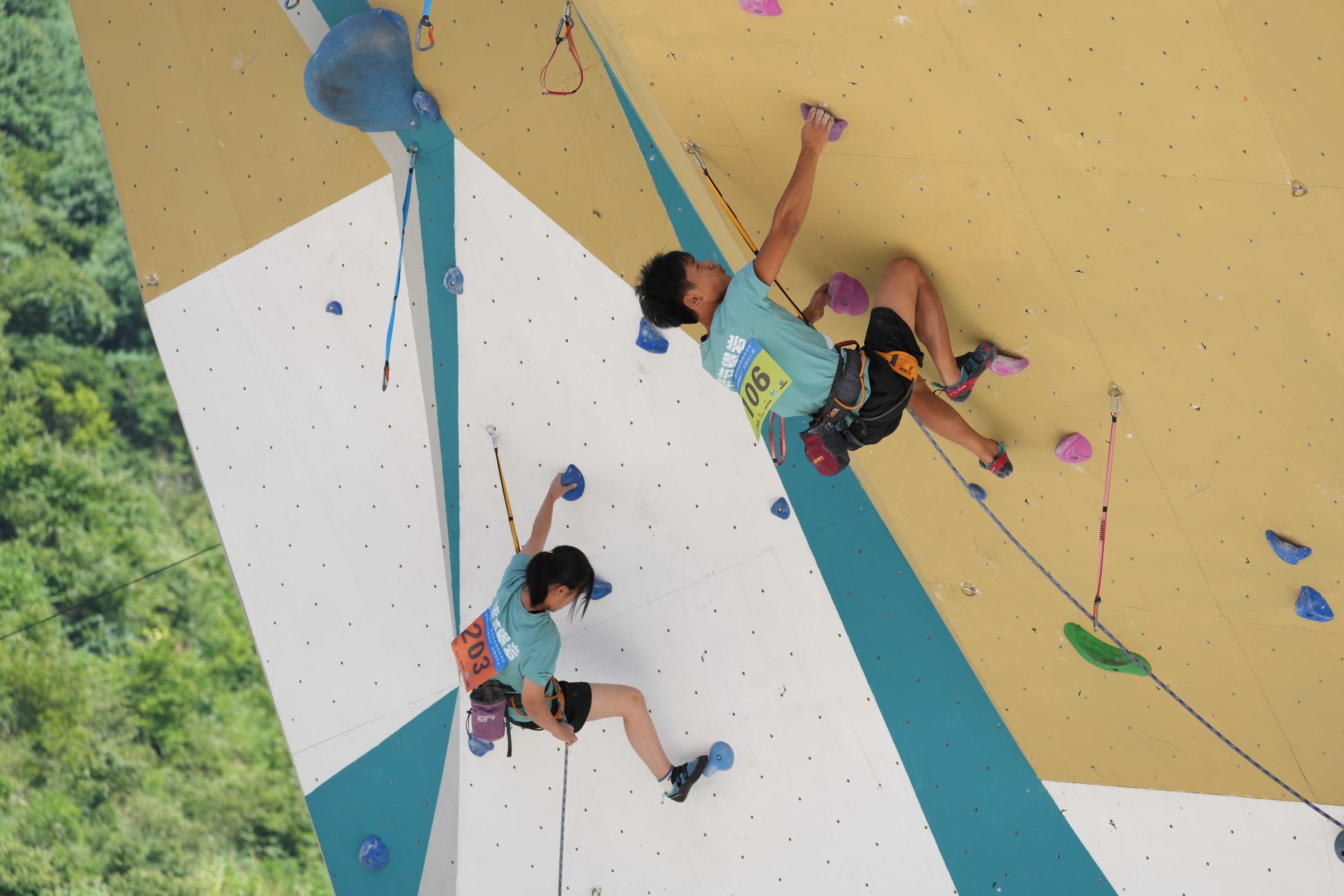 当天进行了男子甲、乙组,女子甲、乙组攀石和难度项目的预赛,比赛中,选手们手脚并用,不断攀爬、腾挪甚至飞身跳跃,穿梭于岩壁之上,全力攀登到最高处。