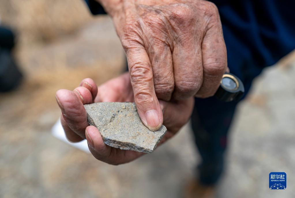 张世山展示在梅树村剖面发现的一块化石,黑点为一种名为软舌螺的古生物(5月10日摄)。新华社记者 陈欣波 摄