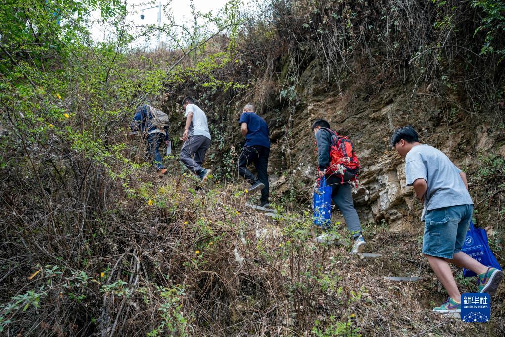 张世山(左一)带领中国前寒武系省级地质自然保护区管护局的年轻人巡护梅树村剖面(5月10日摄)。新华社记者 陈欣波 摄