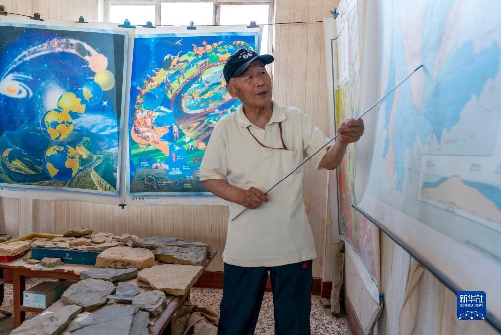 张世山在收藏化石的标本馆内讲解古生物化石知识(5月10日摄)。新华社记者 陈欣波 摄