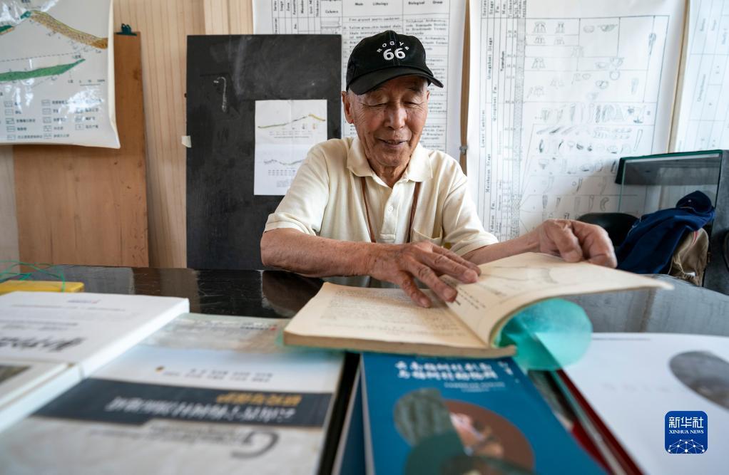 张世山在收藏化石的标本馆内翻阅古生物化石书籍(5月10日摄)。新华社记者 陈欣波 摄