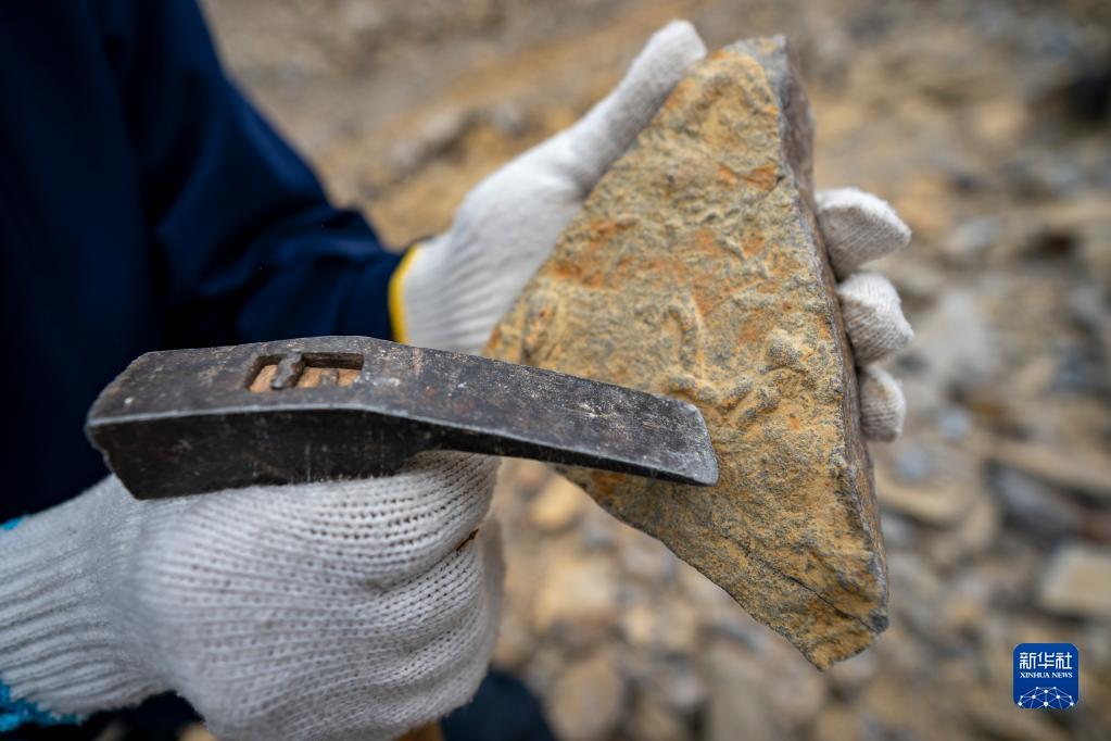这是张世山在昆阳磷矿矿坑里搜寻到的一块遗迹化石,凸起为某种古生物活动留下的痕迹(5月10日摄)。新华社记者 陈欣波 摄