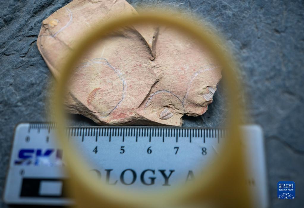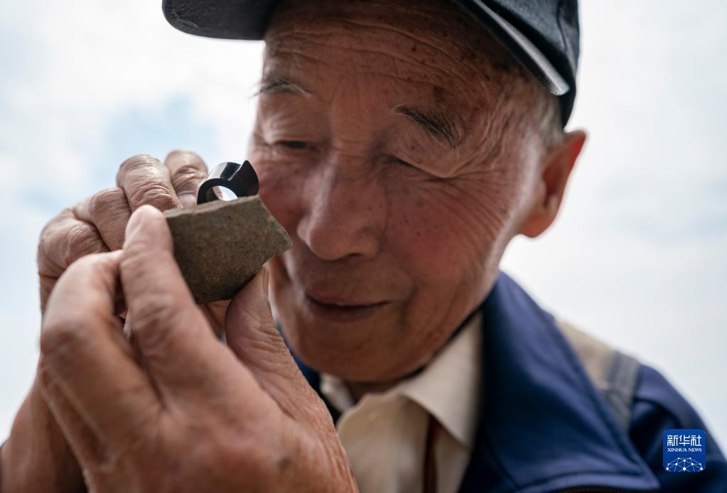 张世山在巡护梅树村剖面途中使用随身携带的放大镜观察软舌螺化石(5月10日摄)。新华社记者 陈欣波 摄