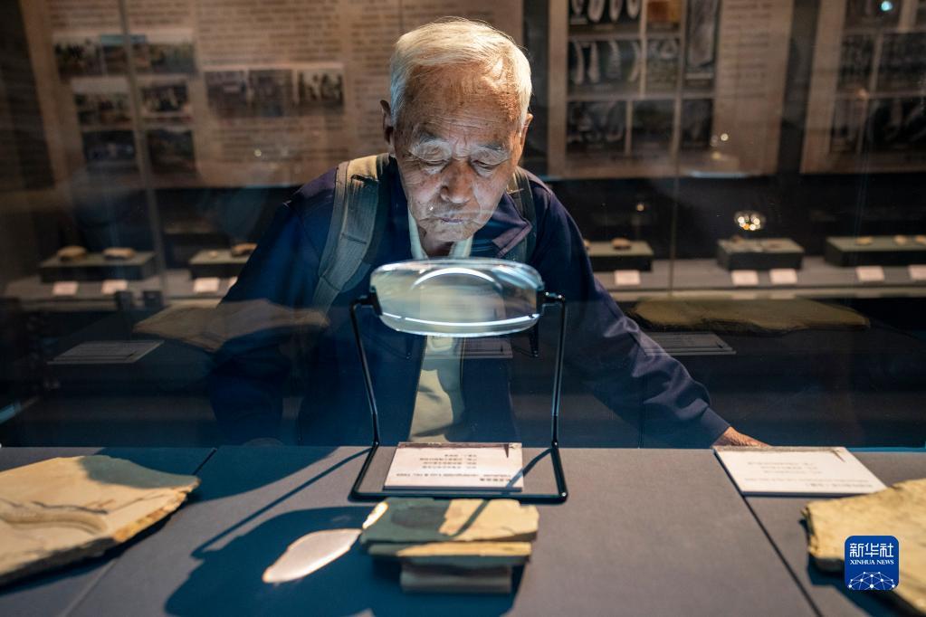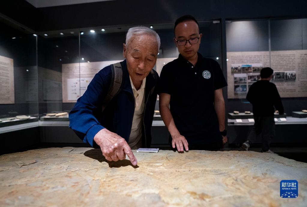 张世山在昆明晋宁博物馆内查看一块由他提供的古生物化石(5月10日摄)。新华社记者 陈欣波 摄