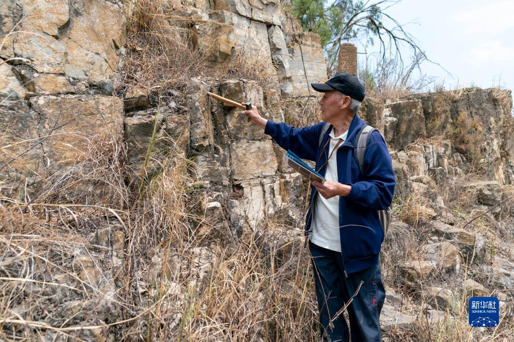 张世山在梅树村剖面一处岩石断层前查看岩石(5月10日摄)。新华社记者 陈欣波 摄