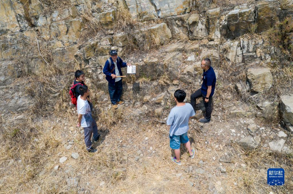 张世山(右三)在梅树村剖面一处岩石断层前给中国前寒武系省级地质自然保护区管护局的几个年轻人讲解(5月10日摄,无人机照片)。新华社记者 陈欣波 摄