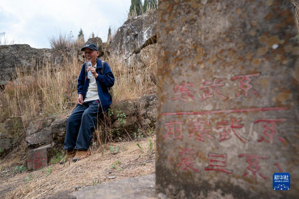 张世山在巡护梅树村剖面途中休息(5月10日摄)。新华社记者 陈欣波 摄