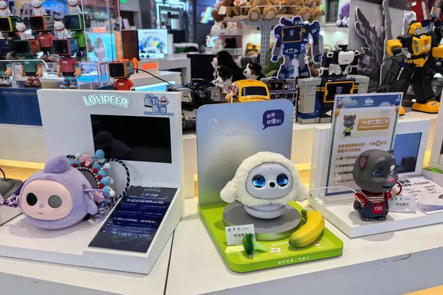 记者走访发现,在多家母婴连锁店和线下商超的玩具专区,仿生陪伴款、早教机器人等AI玩具被摆在了显眼位置。