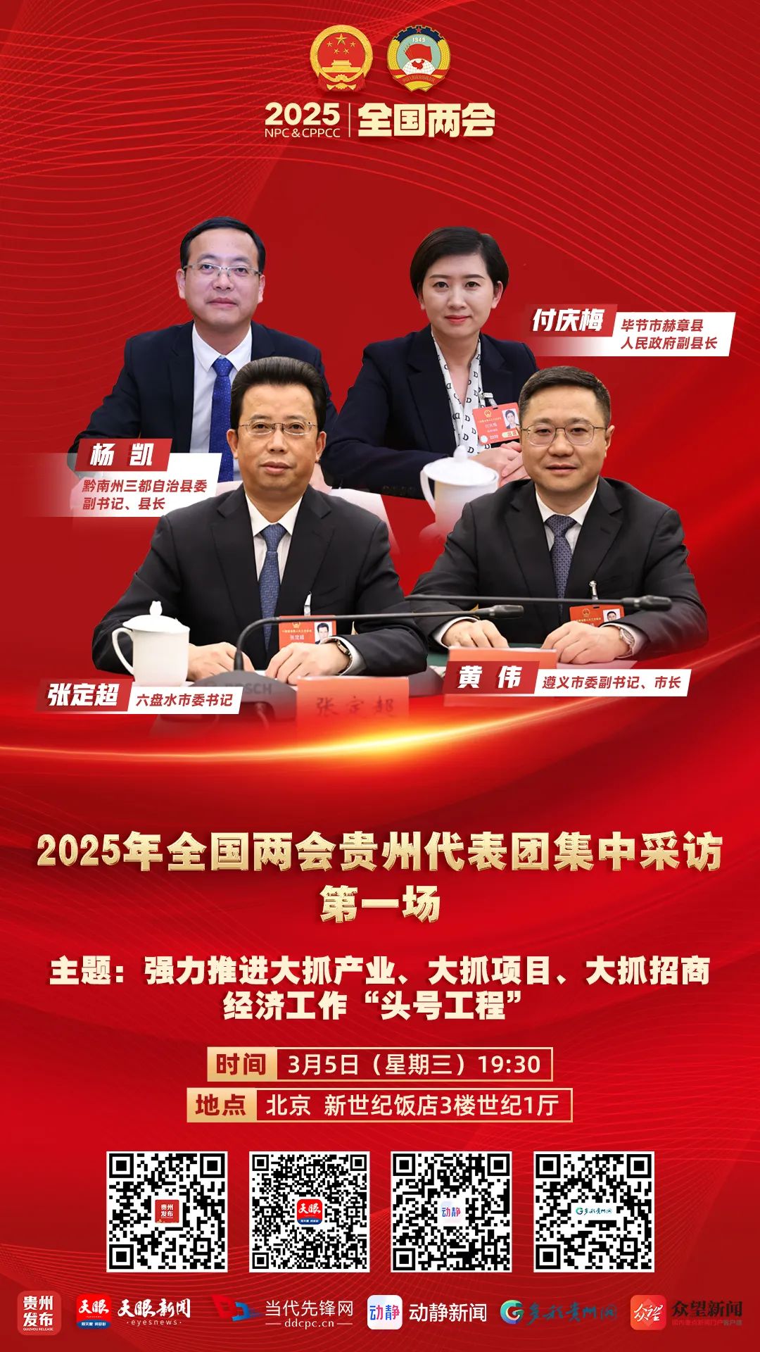 2025年全国两会贵州代表团集中采访(第一场)将于3月5日(星期三)19:30在北京新世纪饭店3楼世纪1厅举行。