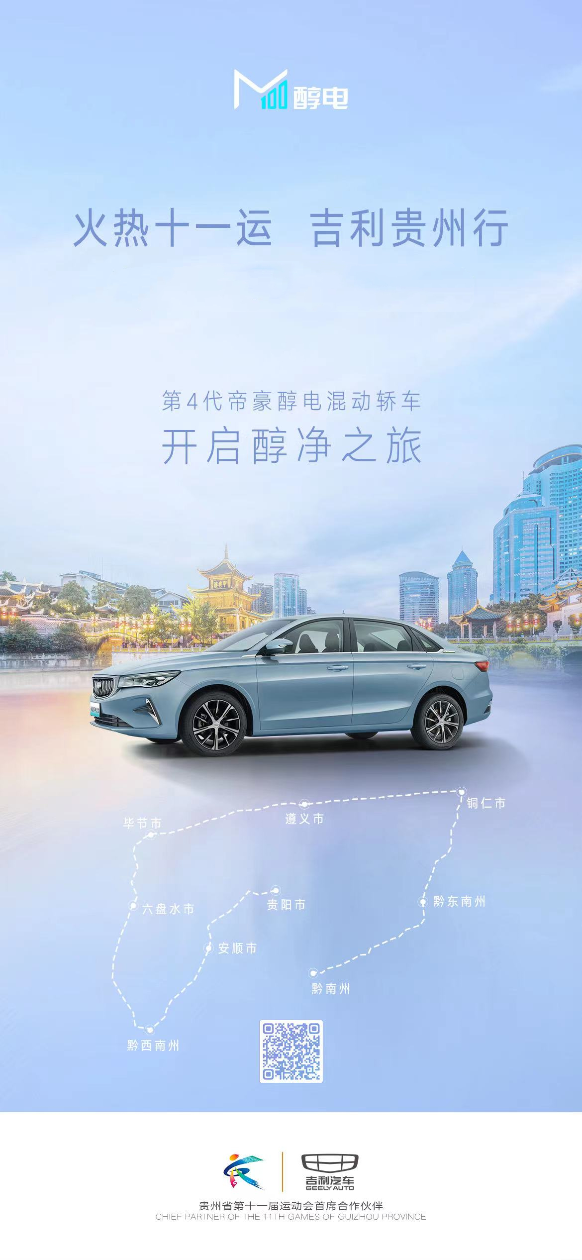贵州省第十一届运动会赛事指定用车——第4代帝豪醇电混动轿车绕行贵阳、安顺、兴义、黔南、黔东南、铜仁、遵义、毕节、六盘水共九市州,长达千里的巡游路程,充分展示了吉利先进的造车技术和领先的甲醇技术。在山水间驰骋,见证现代与历史、科技与自然的碰撞,翠山春水,氤氲天地,越过群山之巅,冲破云层。