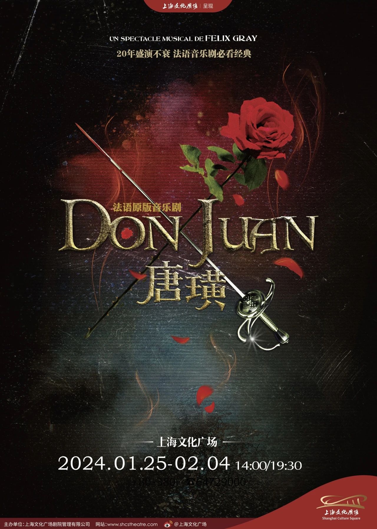 作为上海文化广场2023年末演出季压轴之作,法语原版音乐剧《唐璜》由法国作曲家费利克斯·格雷于2003年创作,由法语音乐剧《巴黎圣母院》导演吉勒·马修于2004年搬上舞台,在法国、加拿大等地的演出都获得了巨大成功,20年来热演不衰。