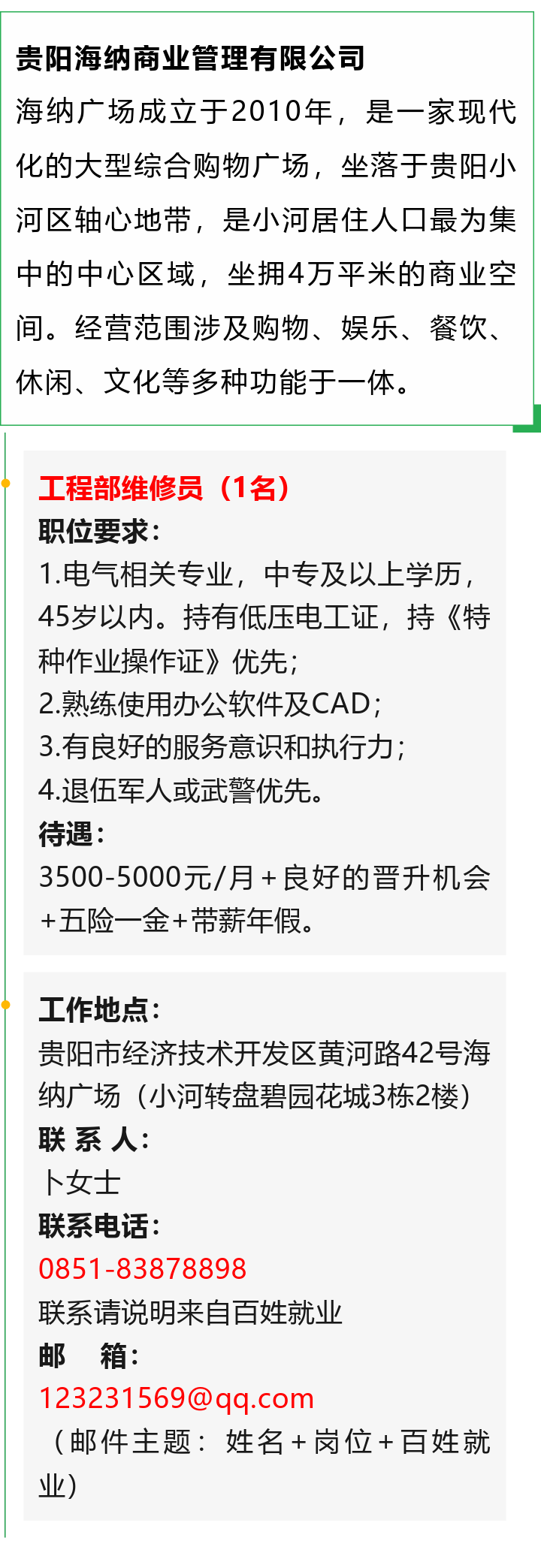 【知名企业】贵阳海纳商业管理有限公司招聘!中专起报!五险一金!