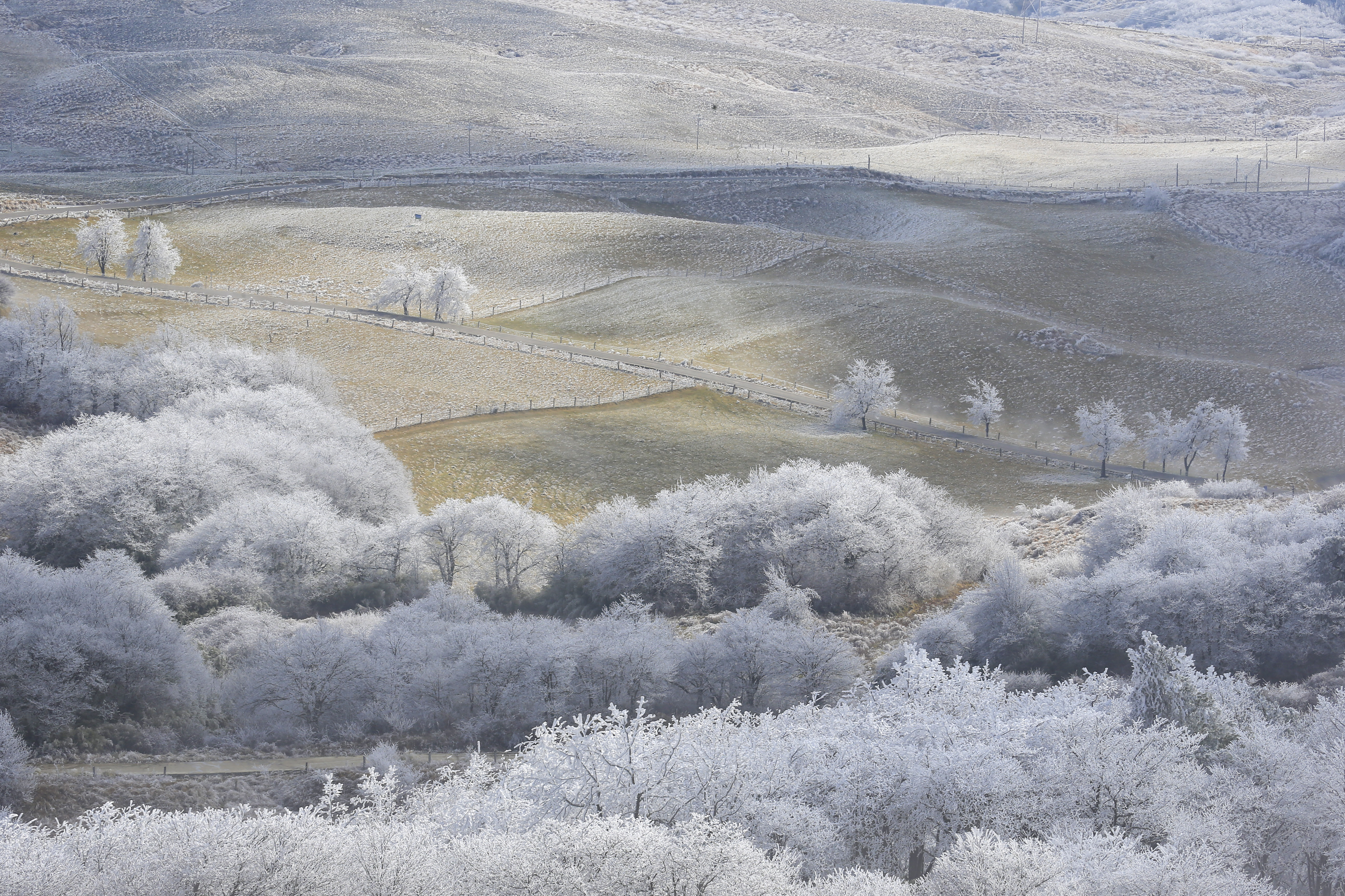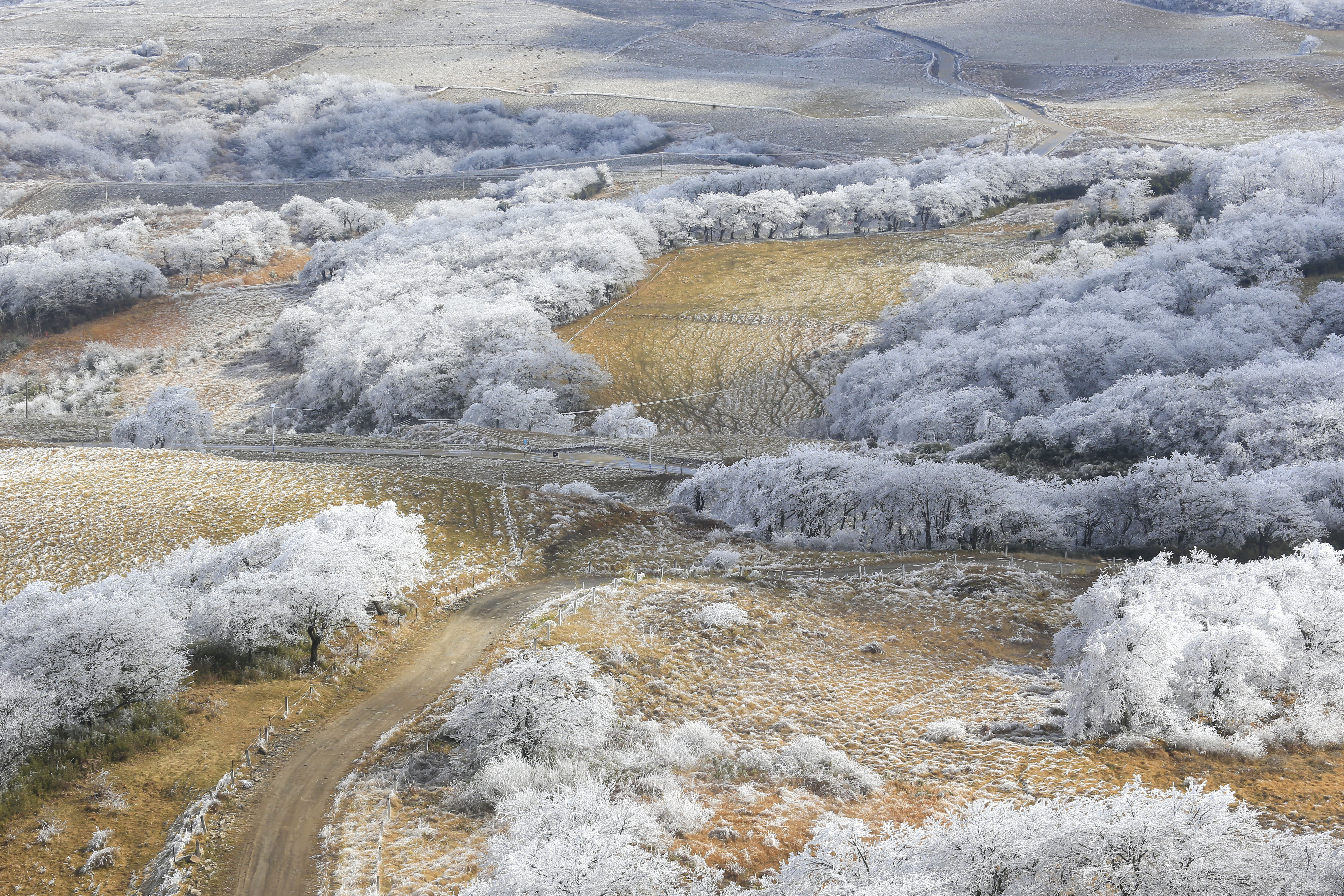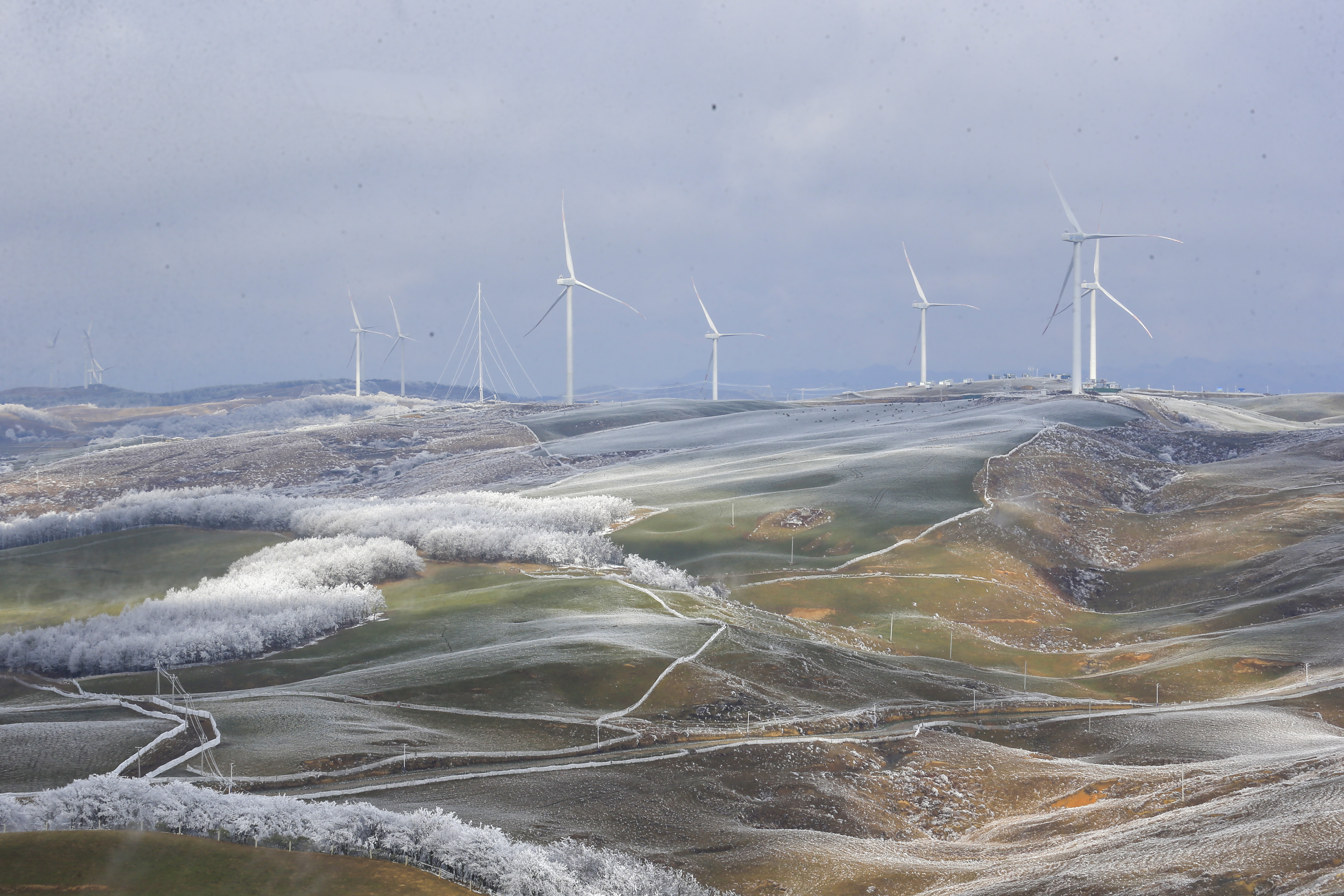 而在贵州西北部的威宁,一场更为壮阔的冰雪盛宴正在上演。由于独特的高原地貌与开阔的草场环境,位于雪山镇的灼甫万亩草场,呈现出了与众不同的雾凇奇观。这里没有密集的森林,但当低温凝冻天气来临,广袤的草场丘陵、矗立的风力发电机、乃至每一丛枯草,都会被晶莹的雾凇均匀包裹。