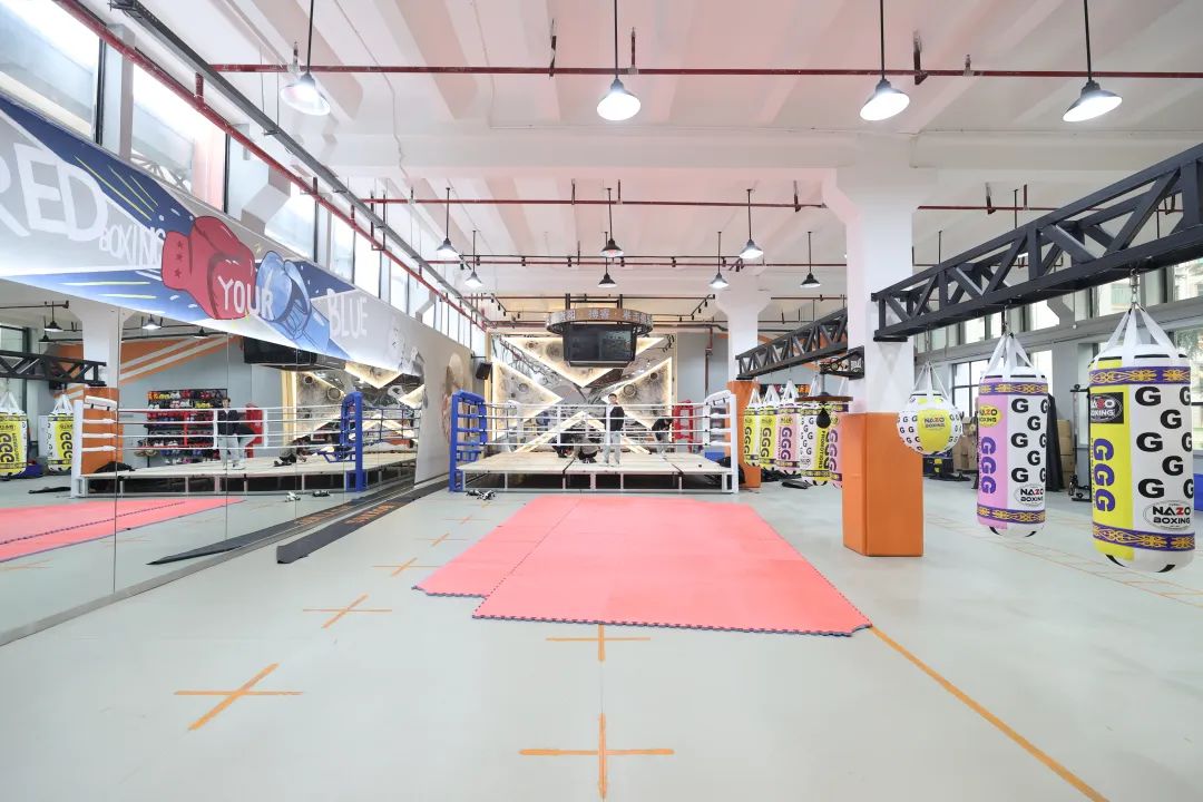 来到二楼,面向3-8岁儿童的体适能馆已经建设完毕,馆内各种特别的设计元素透露着时尚。在已经建设完毕的拳击馆内,各种器材已经到位,更衣室已投入使用。舞台上方的投影大屏,不仅能实时观看比赛,还能监测运动员身体状况。